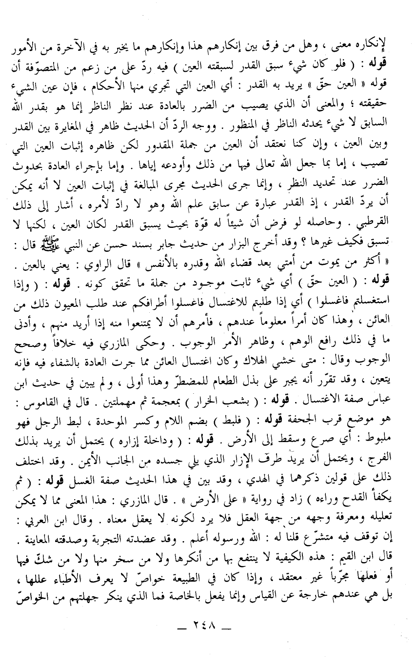 ـــــــــــــــــــــــــــــQلَإِنْكَارِهِ مَعْنًى، وَهَلْ مِنْ فَرْقٍ بَيْنِ إنْكَارِهِمْ هَذَا وَإِنْكَارِهِمْ مَا يُخْبَرُ بِهِ فِي الْآخِرَةِ مِنْ الْأُمُورِ قَوْلُهُ: (فَلَوْ كَانَ شَيْءٌ سَبَقَ الْقَدَرَ لَسَبَقَتْهُ الْعَيْنُ) فِيهِ رَدٌّ عَلَى مَنْ زَعَمَ مِنْ الْمُتَصَوِّفَةِ أَنَّ قَوْلَهُ " الْعَيْنُ حَقٌّ " يُرِيدُ بِهِ الْقَدَرَ: أَيْ الْعَيْنُ الَّتِي تَجْرِي مِنْهَا الْأَحْكَامُ، فَإِنَّ عَيْنَ الشَّيْءِ حَقِيقَتُهُ، وَالْمَعْنَى أَنَّ الَّذِي يُصِيبُ مِنْ الضَّرَرِ بِالْعَادَةِ عِنْدَ نَظَرِ النَّاظِرِ إنَّمَا هُوَ بِقَدَرِ اللَّهِ السَّابِقِ لَا شَيْءَ يُحْدِثُهُ النَّاظِرُ فِي الْمَنْظُورِ