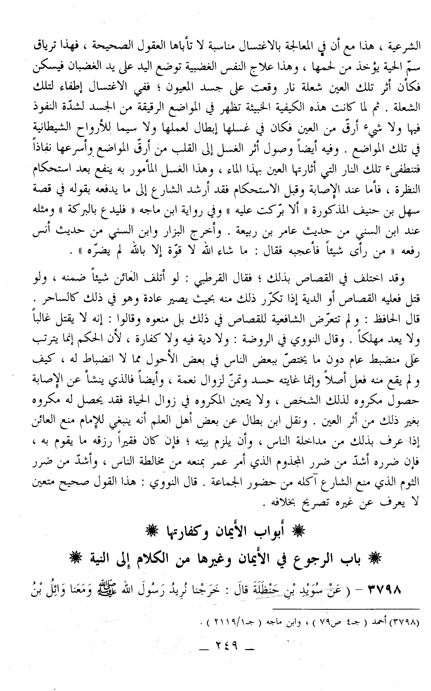 وَقَدْ اُخْتُلِفَ فِي الْقِصَاصِ بِذَلِكَ، فَقَالَ الْقُرْطُبِيُّ: لَوْ أَتْلَفَ الْعَائِنُ شَيْئًا ضَمِنَهُ، وَلَوْ قَتَلَ فَعَلَيْهِ الْقِصَاصُ أَوْ الدِّيَةُ إذَا تَكَرَّرَ ذَلِكَ مِنْهُ بِحَيْثُ يَصِيرُ عَادَةً وَهُوَ فِي ذَلِكَ كَالسَّاحِرِ. قَالَ الْحَافِظُ: وَلَمْ تَتَعَرَّضْ الشَّافِعِيَّةُ لِلْقِصَاصِ فِي ذَلِكَ بَلْ مَنَعُوهُ وَقَالُوا: إنَّهُ لَا يَقْتُلُ غَالِبًا وَلَا يُعَدُّ مُهْلِكًا وَقَالَ النَّوَوِيُّ فِي الرَّوْضَةِ: وَلَا دِيَةَ فِيهِ وَلَا كَفَّارَةَ، لِأَنَّ الْحُكْمَ إنَّمَا يَتَرَتَّبُ عَلَى مُنْضَبِطٍ عَامٍّ دُونَ مَا يَخْتَصُّ بِبَعْضِ النَّاسِ فِي بَعْضِ الْأَحْوَالِ مِمَّا لَا انْضِبَاطَ لَهُ، كَيْفَ وَلَمْ يَقَعْ مِنْهُ فِعْلٌ أَصْلًا وَإِنَّمَا غَايَتُهُ حَسَدٌ وَتَمَنٍّ لِزَوَالِ نِعْمَةٍ، وَأَيْضًا فَاَلَّذِي يَنْشَأُ عَنْ الْإِصَابَةِ حُصُولُ مَكْرُوٍ لِذَلِكَ الشَّخْصِ، وَلَا يَتَعَيَّنُ الْمَكْرُوهُ فِي زَوَالِ الْحَيَاةِ فَقَدْ يَحْصُلُ لَهُ مَكْرُوهٌ بِغَيْرِ ذَلِكَ مِنْ أَثَرِ الْعَيْنِ. وَنَقَلَ ابْنُ بَطَّالٍ عَنْ بَعْضِ أَهْلِ الْعِلْمِ أَنَّهُ يَنْبَغِي لِلْإِمَامِ مَنْعُ الْعَائِنِ إذَا عُرِفَ بِذَلِكَ مِنْ مُدَاخَلَةِ النَّاسِ، وَأَنْ يَلْزَمَ بَيْتَهُ، فَإِنْ كَانَ فَقِيرًا رَزَقَهُ مَا يَقُومُ بِهِ، فَإِنَّ ضَرَرَهُ أَشَدُّ مِنْ ضَرَرِ الْمَجْذُومِ الَّذِي أَمَرَ عُمَرُ بِمَنْعِهِ مِنْ مُخَالَطَةِ النَّاسِ، وَأَشَدُّ مِنْ ضَرَرِ الثُّومِ الَّذِي مَنَعَ الشَّارِعُ آكِلَهُ مِنْ حُضُورِ الْجَمَاعَةِ