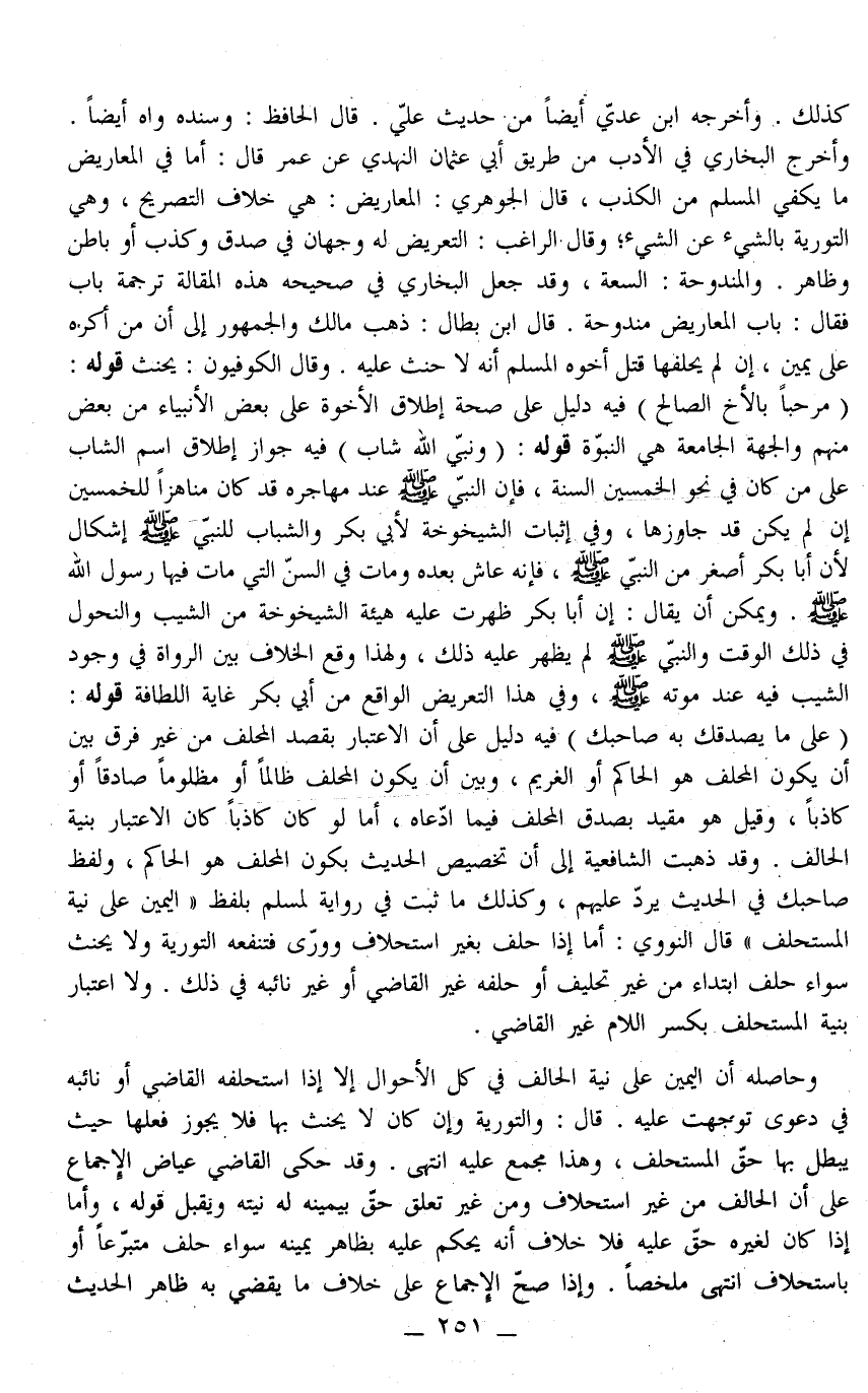 وَأَخْرَجَ الْبُخَارِيُّ فِي الْأَدَبِ مِنْ طَرِيقِ أَبِي عُثْمَانَ النَّهْدِيِّ عَنْ عُمَرَ قَالَ: أَمَّا فِي الْمَعَارِيضِ مَا يَكْفِي الْمُسْلِمَ مِنْ الْكَذِبِ، قَالَ الْجَوْهَرِيُّ: الْمَعَارِيضُ: هِيَ خِلَافُ التَّصْرِيحِ، وَهِيَ التَّوْرِيَةُ بِالشَّيْءِ عَنْ الشَّيْءِ، وَقَالَ الرَّاغِبُ: التَّعْرِيضُ لَهُ وَجْهَانِ فِي صِدْقٍ وَكَذِبٍ أَوْ بَاطِنٍ وَظَاهِرٍ. وَالْمَنْدُوحَةُ: السِّعَةُ، وَقَدْ جَعَلَ الْبُخَارِيُّ فِي صَحِيحِهِ هَذِهِ الْمَقَالَةَ تَرْجَمَةَ بَابٍ فَقَالَ: بَابُ الْمَعَارِيضِ مَنْدُوحَةٌ. قَالَ ابْنُ بَطَّالٍ: ذَهَبَ مَالِكٌ وَالْجُمْهُورُ إلَى أَنَّ مَنْ أُكْرِهَ عَلَى يَمِينٍ، إنْ لَمْ يَحْلِفْهَا قُتِلَ أَخُوهُ الْمُسْلِمُ أَنَّهُ لَا حِنْثَ عَلَيْهِ
