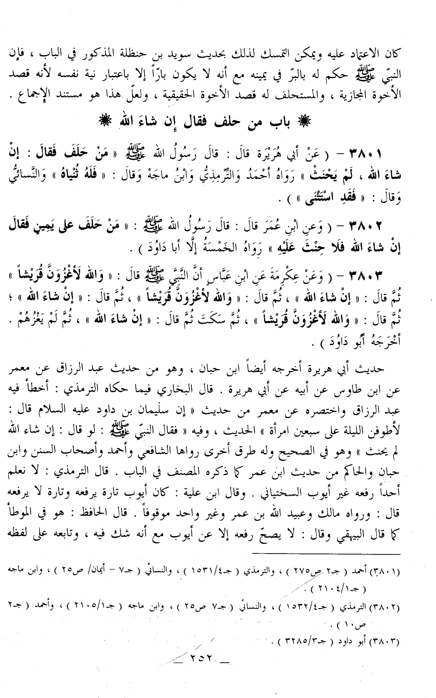 3802 - (وَعَنْ ابْنِ عُمَرَ قَالَ: قَالَ رَسُولُ اللَّهِ - صَلَّى اللَّهُ عَلَيْهِ وَسَلَّمَ -: «مَنْ حَلَفَ عَلَى يَمِينٍ فَقَالَ إنْ شَاءَ اللَّهُ فَلَا حِنْثَ عَلَيْهِ» رَوَاهُ الْخَمْسَةُ إلَّا أَبَا دَاوُد) .