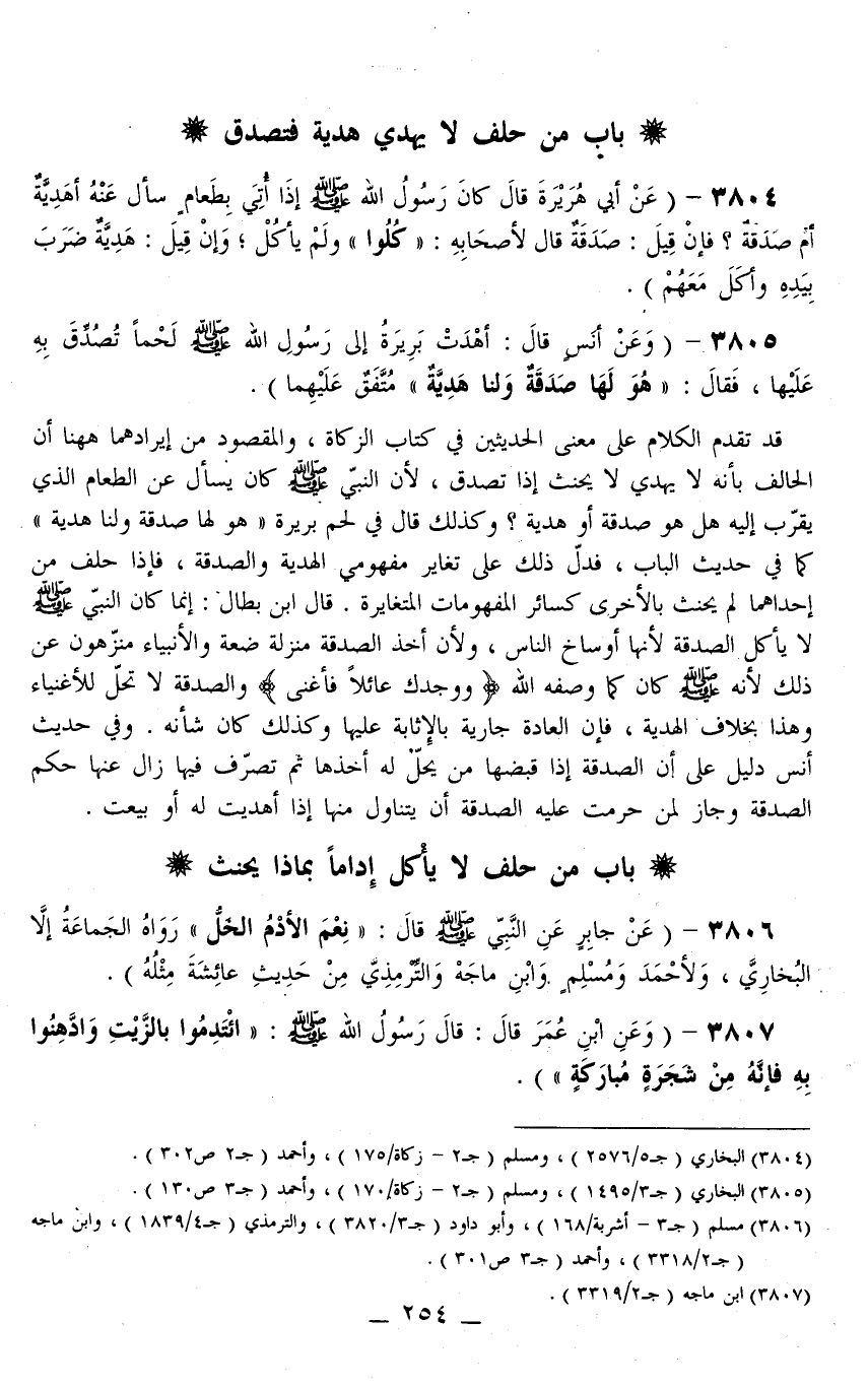 3804 - (عَنْ أَبِي هُرَيْرَةَ قَالَ «كَانَ رَسُولُ اللَّهِ - صَلَّى اللَّهُ عَلَيْهِ وَسَلَّمَ - إذَا أُتِيَ بِطَعَامٍ سَأَلَ عَنْهُ أَهَدِيَّةٌ أَمْ صَدَقَةٌ؟ فَإِنْ قِيلَ: صَدَقَةٌ قَالَ لِأَصْحَابِهِ: كُلُوا وَلَمْ يَأْكُلْ، وَإِنْ قِيلَ: هَدِيَّةٌ ضَرَبَ بِيَدِهِ، وَأَكَلَ مَعَهُمْ» ) .