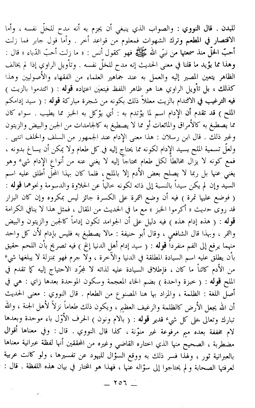 وَتَأْوِيلُ الرَّاوِي إذَا لَمْ يُخَالِفْ الظَّاهِرَ يَتَعَيَّنُ الْمَصِيرُ إلَيْهِ وَالْعَمَلُ بِهِ عِنْدَ جَمَاهِيرِ الْعُلَمَاءِ مِنْ الْفُقَهَاءِ وَالْأُصُولِيِّينَ وَهَذَا كَذَلِكَ، بَلْ تَأْوِيلُ الرَّاوِي هُنَا هُوَ ظَاهِرُ اللَّفْظِ فَيَتَعَيَّنُ اعْتِمَادُهُ قَوْلُهُ: «ائْتَدِمُوا بِالزَّيْتِ» فِيهِ التَّرْغِيبُ فِي الِائْتِدَامِ بِالزَّيْتِ مُعَلِّلًا ذَلِكَ بِكَوْنِهِ مِنْ شَجَرَةٍ مُبَارَكَةٍ قَوْلُهُ: «سَيِّدُ إدَامِكُمْ الْمِلْحُ» قَدْ تَقَدَّمَ أَنَّ الْإِدَامَ اسْمٌ لِمَا يُؤْتَدَمُ بِهِ: أَيْ يُؤْكَلُ بِهِ الْخُبْزُ مِمَّا يَطِيبُ. سَوَاءٌ كَانَ مِمَّا يُصْطَبَغُ بِهِ كَالْأَمْرَاقِ وَالْمَائِعَاتِ أَوْ مِمَّا لَا يُصْطَبَغُ بِهِ كَالْجَامِدَاتِ مِنْ الْجُبْنِ وَالْبَيْضِ وَالزَّيْتُونِ وَغَيْرِ ذَلِكَ