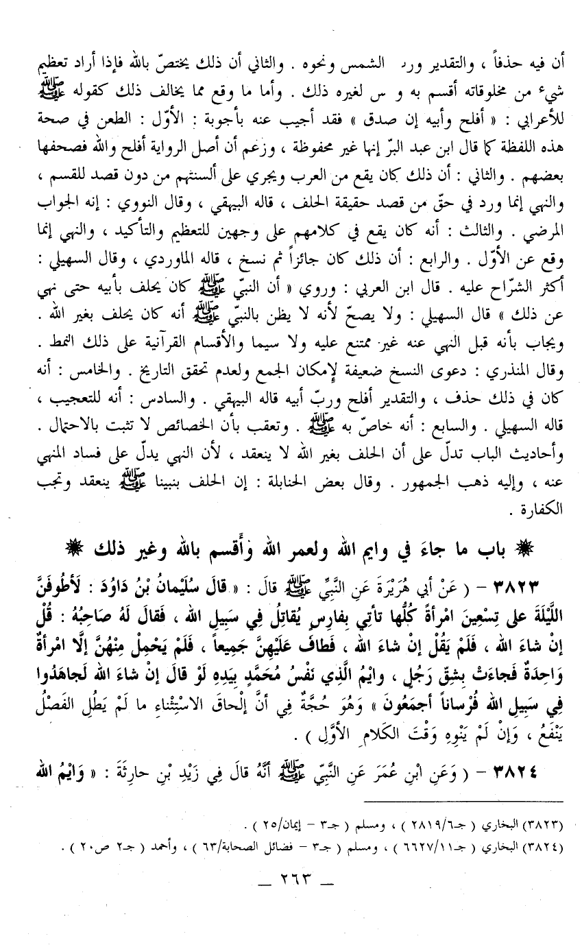 3823 - (عَنْ أَبِي هُرَيْرَةَ عَنْ النَّبِيِّ - صَلَّى اللَّهُ عَلَيْهِ وَسَلَّمَ - قَالَ: «قَالَ سُلَيْمَانُ بْنُ دَاوُد: لَأَطُوفَنَّ اللَّيْلَةَ عَلَى تِسْعِينَ امْرَأَةً كُلُّهَا تَأْتِي بِفَارِسٍ يُقَاتِلُ فِي سَبِيلِ اللَّهِ، فَقَالَ لَهُ صَاحِبُهُ: قُلْ إنْ شَاءَ اللَّهُ، فَلَمْ يَقُلْ إنْ شَاءَ اللَّهُ، فَطَافَ عَلَيْهِنَّ جَمِيعًا، فَلَمْ يَحْمِلْ مِنْهُنَّ إلَّا امْرَأَةٌ وَاحِدَةٌ فَجَاءَتْ بِشِقِّ رَجُلٍ، وَأَيْمُ الَّذِي نَفْسُ مُحَمَّدٍ بِيَدِهِ لَوْ قَالَ إنْ شَاءَ اللَّهُ لَجَاهَدُوا فِي سَبِيلِ اللَّهِ فُرْسَانًا أَجْمَعُونَ» وَهُوَ حُجَّةٌ فِي أَنَّ إلْحَاقَ الِاسْتِثْنَاءِ مَا لَمْ يَطُلْ الْفَصْلُ يَنْفَعُ، وَإِنْ لَمْ يَنْوِهِ وَقْتَ الْكَلَامِ الْأَوَّلِ)