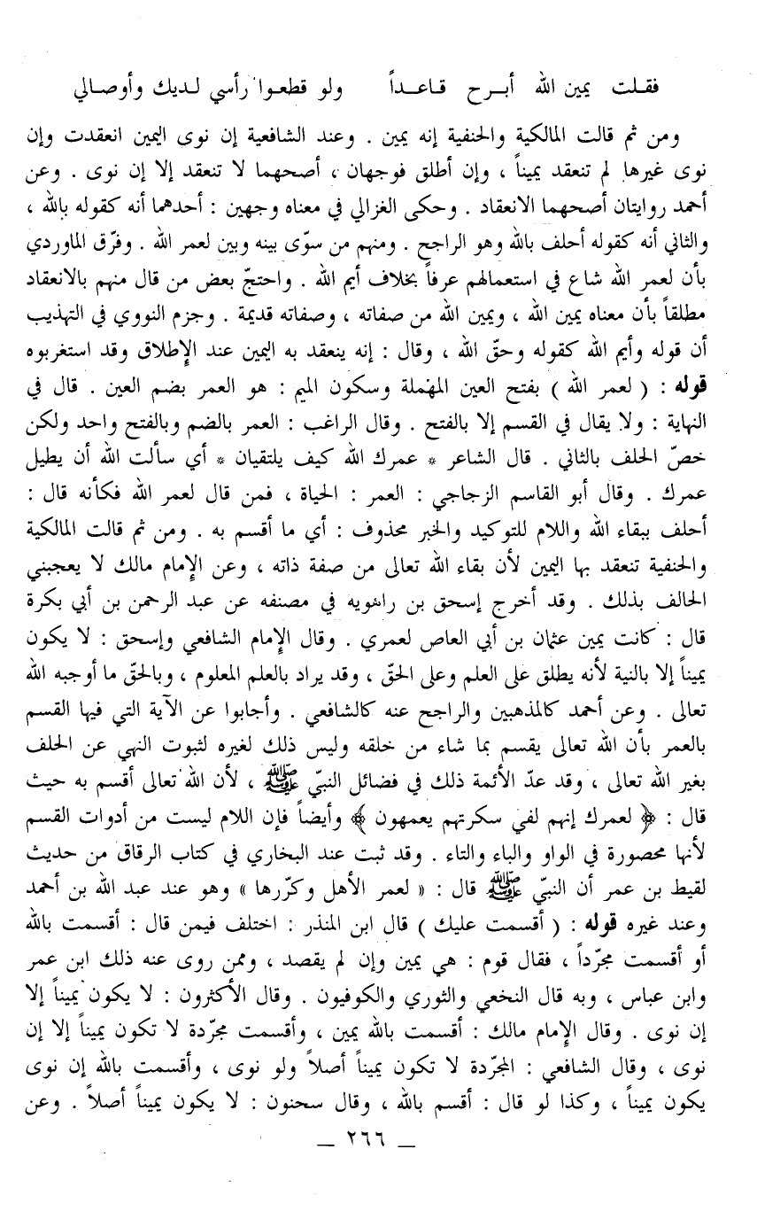 وَقَالَ أَبُو الْقَاسِمِ الزَّجَّاجِيُّ: الْعُمْرُ: الْحَيَاةُ، فَمَنْ قَالَ لَعَمْرُ اللَّهِ فَكَأَنَّهُ قَالَ: أَحْلِفُ بِبَقَاءِ اللَّهِ وَاللَّامُ لِلتَّوْكِيدِ وَالْخَبَرُ مَحْذُوفٌ: أَيْ مَا أُقْسِمُ بِهِ. وَمِنْ ثَمَّ قَالَتْ الْمَالِكِيَّةُ وَالْحَنَفِيَّةُ تَنْعَقِدُ بِهَا الْيَمِينُ لِأَنَّ بَقَاءَ اللَّهِ تَعَالَى مِنْ صِفَةِ ذَاتِهِ، وَعَنْ الْإِمَامِ مَالِكٍ لَا يُعْجِبُنِي الْحَالِفُ بِذَلِكَ. وَقَدْ أَخْرَجَ إِسْحَاقُ بْنُ رَاهْوَيْهِ فِي مُصَنَّفِهِ عَنْ عَبْدِ الرَّحْمَنِ بْنِ أَبِي بَكْرَةَ قَالَ: كَانَتْ يَمِينُ عُثْمَانَ بْنِ أَبِي الْعَاصِ لَعَمْرِي
