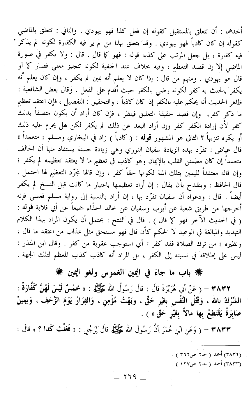 3832 - (عَنْ أَبِي هُرَيْرَةَ قَالَ: قَالَ رَسُولُ اللَّهِ - صَلَّى اللَّهُ عَلَيْهِ وَسَلَّمَ -: «خَمْسٌ لَيْسَ لَهُنَّ كَفَّارَةٌ: الشِّرْكُ بِاَللَّهِ، وَقَتْلُ النَّفْسِ بِغَيْرِ حَقٍّ وَبَهْتُ مُؤْمِنٍ، وَالْفِرَارُ يَوْمَ الزَّحْفِ، وَيَمِينٌ صَابِرَةٌ يَقْتَطِعُ بِهَا مَالًا بِغَيْرِ حَقٍّ» ) .