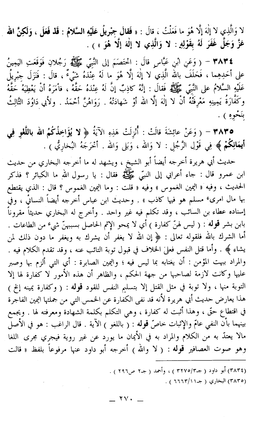 3834 - (وَعَنْ ابْنِ عَبَّاسٍ قَالَ: «اخْتَصَمَ إلَى النَّبِيِّ - صَلَّى اللَّهُ عَلَيْهِ وَسَلَّمَ - رَجُلَانِ فَوَقَعَتْ الْيَمِينُ عَلَى أَحَدِهِمَا، فَحَلَفَ بِاَللَّهِ الَّذِي لَا إلَهَ إلَّا هُوَ مَا لَهُ عِنْدَهُ شَيْءٌ، قَالَ: فَنَزَلَ جِبْرِيلُ - عَلَيْهِ السَّلَامُ - عَلَى النَّبِيِّ - صَلَّى اللَّهُ عَلَيْهِ وَسَلَّمَ - فَقَالَ: إنَّهُ كَاذِبٌ إنَّ لَهُ عِنْدَهُ حَقَّهُ، فَأَمَرَهُ أَنْ يُعْطِيَهُ حَقَّهُ، وَكَفَّارَةُ يَمِينِهِ مَعْرِفَتُهُ أَنْ لَا إلَهَ إلَّا اللَّهَ أَوْ شَهَادَتُهُ» رَوَاهُنَّ أَحْمَدُ. وَلِأَبِي دَاوُد الثَّالِثُ بِنَحْوِهِ) .