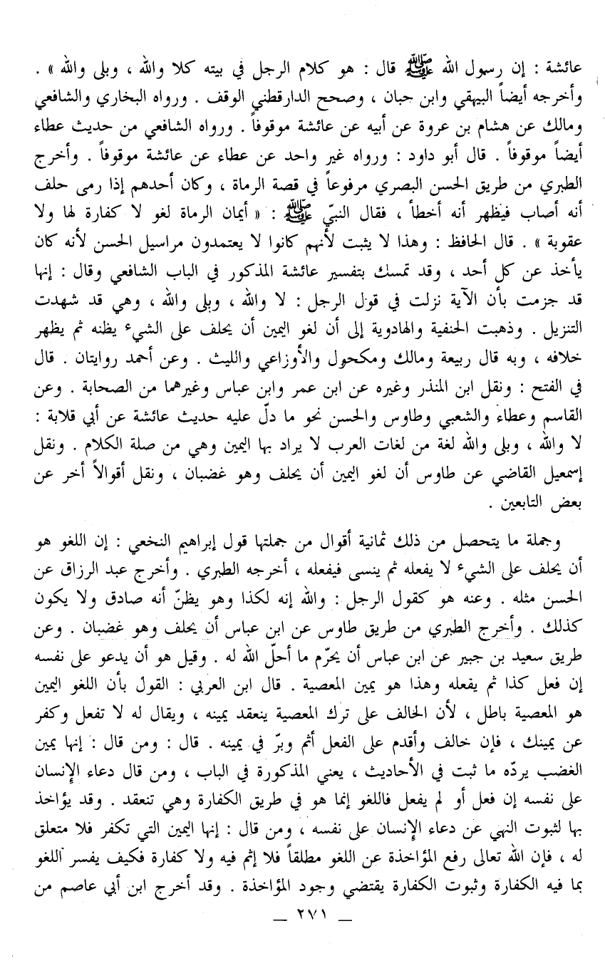 وَعَنْ الْقَاسِمِ وَعَطَاءٍ وَالشَّعْبِيِّ وَطَاوُوسٍ وَالْحَسَنِ نَحْوَ مَا دَلَّ عَلَيْهِ حَدِيثُ عَائِشَةَ عَنْ أَبِي قِلَابَةَ: لَا وَاَللَّهِ، وَبَلَى وَاَللَّهِ لُغَةٌ مِنْ لُغَاتِ الْعَرَبِ لَا يُرَادُ بِهَا الْيَمِينُ وَهِيَ مِنْ صِلَةِ الْكَلَامِ وَنَقَلَ إسْمَاعِيلُ الْقَاضِي عَنْ طَاوُسٍ أَنَّ لَغْوَ الْيَمِينِ أَنْ يَحْلِفَ وَهُوَ غَضْبَانُ، وَنَقَلَ أَقْوَالًا أُخَرَ عَنْ بَعْضِ التَّابِعِينَ. وَجُمْلَةُ مَا يَتَحَصَّلُ مِنْ ذَلِكَ ثَمَانِيَةُ أَقْوَالٍ مِنْ جُمْلَتِهَا قَوْلُ إبْرَاهِيمَ النَّخَعِيّ: إنَّ اللَّغْوَ هُوَ أَنْ يَحْلِفَ عَلَى الشَّيْءِ لَا يَفْعَلُهُ ثُمَّ يَنْسَى فَيَفْعَلُهُ، أَخْرَجَهُ الطَّبَرِيُّ وَأَخْرَجَ عَبْدُ الرَّزَّاقِ