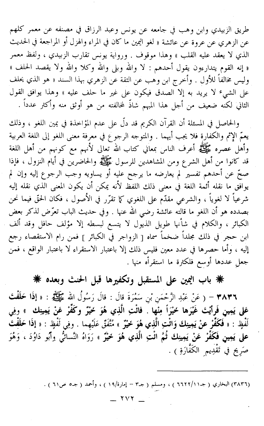 3836 - (عَنْ عَبْدِ الرَّحْمَنِ بْنِ سَمُرَةَ قَالَ: قَالَ رَسُولُ اللَّهِ - صَلَّى اللَّهُ عَلَيْهِ وَسَلَّمَ -: «إذَا حَلَفْتَ عَلَى يَمِينٍ فَرَأَيْتَ غَيْرَهَا خَيْرًا مِنْهَا. فَائْتِ الَّذِي هُوَ خَيْرٌ وَكَفِّرْ عَنْ يَمِينِكَ» وَفِي لَفْظٍ: «فَكَفِّرْ عَنْ يَمِينِكَ وَائْتِ الَّذِي هُوَ خَيْرٌ» مُتَّفَقٌ عَلَيْهِمَا وَفِي لَفْظٍ: «إذَا حَلَفْتَ عَلَى يَمِينٍ فَكَفِّرْ عَنْ يَمِينِكِ ثُمَّ ائْتِ الَّذِي هُوَ خَيْرٌ» رَوَاهُ النَّسَائِيّ وَأَبُو دَاوُد، وَهُوَ صَرِيحٌ فِي تَقْدِيمِ الْكَفَّارَةِ) .