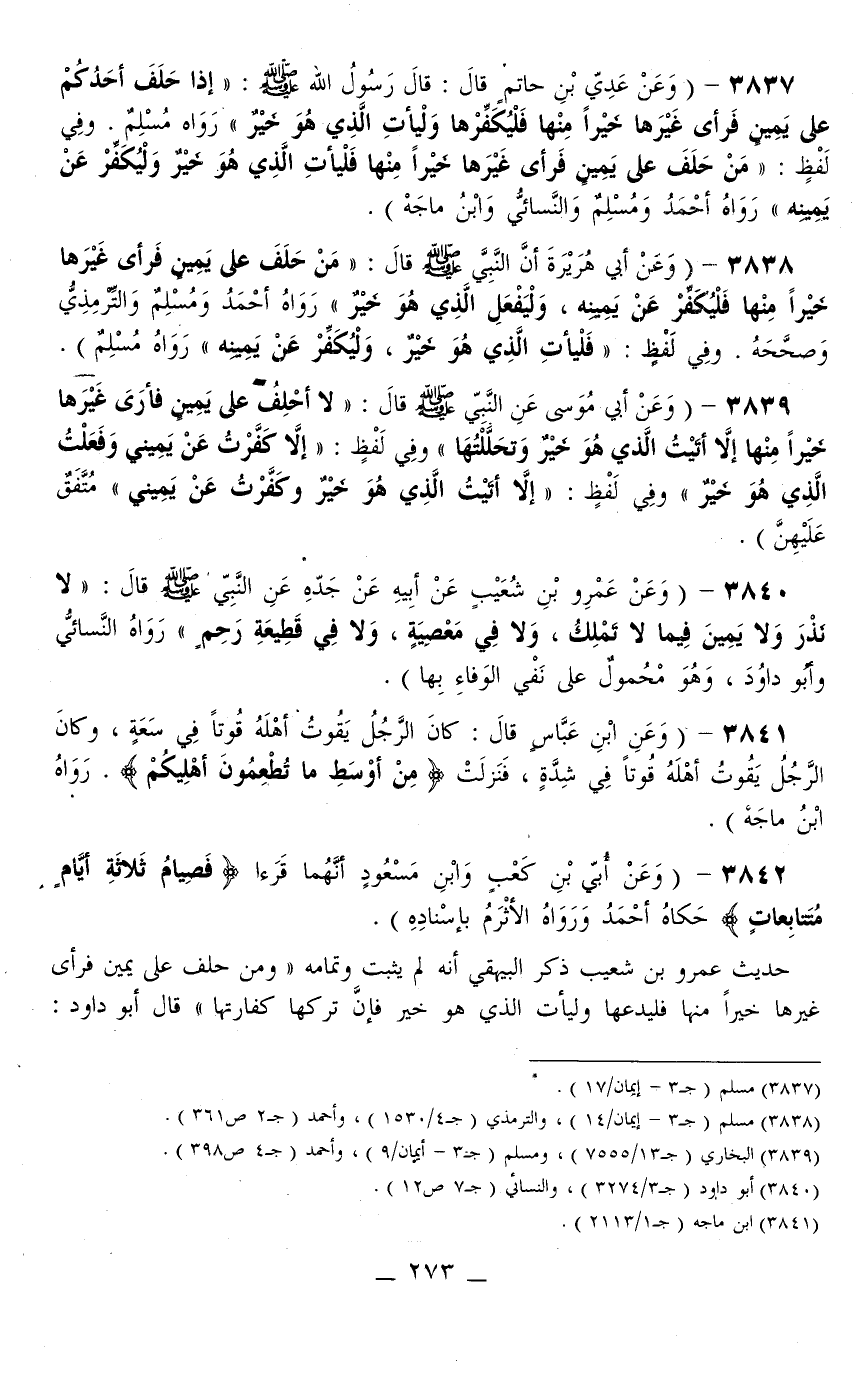 وَفِي لَفْظٍ: «مَنْ حَلَفَ عَلَى يَمِينٍ فَرَأَى غَيْرَهَا خَيْرًا مِنْهَا فَلْيَأْتِ الَّذِي هُوَ خَيْرٌ وَلْيُكَفِّرْ عَنْ يَمِينِهِ» رَوَاهُ أَحْمَدُ وَمُسْلِمٌ وَالنَّسَائِيُّ وَابْنُ مَاجَهْ)