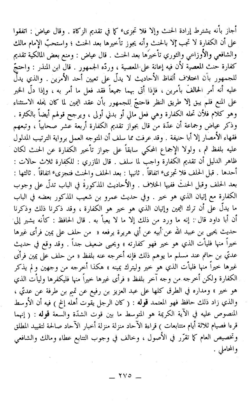 وَاَلَّذِي يَدُلُّ عَلَيْهِ أَنَّهُ أَمَرَ الْحَالِفَ بِأَمْرَيْنِ، فَإِذَا أَتَى بِهِمَا جَمِيعًا فَقَدْ فَعَلَ مَا أُمِرَ بِهِ، وَإِذَا دَلَّ الْخَبَرُ عَلَى الْمَنْعِ فَلَمْ يَبْقَ إلَّا طَرِيقُ النَّظَرِ فَاحْتَجَّ لِلْجُمْهُورِ بِأَنَّ عَقْدَ الْيَمِينِ مَا كَانَ يُحِلُّهُ الِاسْتِثْنَاءُ وَهُوَ كَلَامٌ فَلَأَنْ تُحِلَّهُ الْكَفَّارَةُ وَهِيَ فِعْلٌ مَالِيٌّ أَوْ بَدَنِيٌّ أَوْلَى، وَيُرَجَّحُ قَوْلُهُمْ أَيْضًا بِالْكَثْرَةِ. وَذَكَرَ عِيَاضٌ وَجَمَاعَةٌ أَنَّ عِدَّةَ مَنْ قَالَ بِجَوَازِ تَقْدِيمِ الْكَفَّارَةِ أَرْبَعَةَ عَشَرَ صَحَابِيًّا، وَتَبِعَهُمْ فُقَهَاءُ الْأَمْصَارِ إلَّا أَبَا حَنِيفَةَ. وَقَدْ عَرَفْتُ مِمَّا سَلَفَ أَنَّ الْمُتَوَجَّهَ الْعَمَلُ بِرِوَايَةِ التَّرْتِيبِ الْمَدْلُولِ عَلَيْهِ بِلَفْظِ ثُمَّ، وَلَوْلَا الْإِجْمَاعُ الْمَحْكِيُّ سَابِقًا عَلَى جَوَازِ تَأْخِيرِ الْكَفَّارَةِ عَنْ الْحِنْثِ لَكَانَ ظَاهِرُ الدَّلِيلِ أَنَّ تَقْدِيمَ الْكَفَّارَةِ وَاجِبٌ لِمَا سَلَفَ