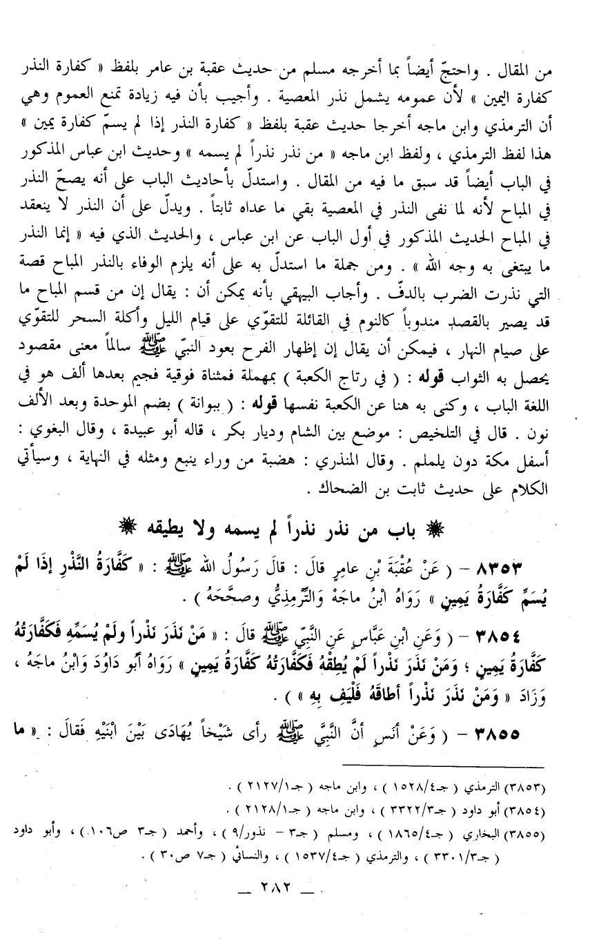 ـــــــــــــــــــــــــــــQمِنْ الْمَقَالِ وَاحْتَجَّ أَيْضًا بِمَا أَخْرَجَهُ مُسْلِمٌ مِنْ حَدِيثِ عُقْبَةَ بْنِ عَامِرٍ بِلَفْظِ «كَفَّارَةُ النَّذْرِ كَفَّارَةُ الْيَمِينِ» لِأَنَّ عُمُومَهُ يَشْمَلُ نَذْرَ الْمَعْصِيَةِ وَأُجِيبَ بِأَنَّ فِيهِ زِيَادَةً تَمْنَعُ الْعُمُومَ وَهِيَ أَنَّ التِّرْمِذِيَّ وَابْنَ مَاجَهْ أَخْرَجَا حَدِيثَ عُقْبَةَ بِلَفْظِ «كَفَّارَةُ النَّذْرِ إذَا لَمْ يُسَمَّ كَفَّارَةُ يَمِينٍ» هَذَا لَفْظُ التِّرْمِذِيِّ، وَلَفْظُ ابْنِ مَاجَهْ «مَنْ نَذَرَ نَذْرًا لَمْ يُسَمِّهِ» .