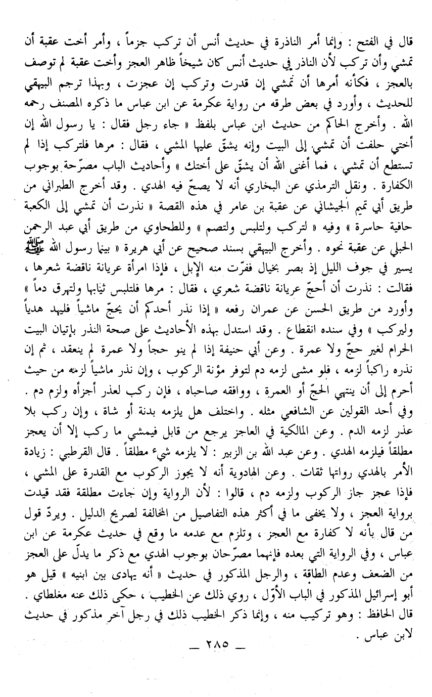 ـــــــــــــــــــــــــــــQقَالَ فِي الْفَتْحِ: وَإِنَّمَا أَمَرَ النَّاذِرَةَ فِي حَدِيثِ أَنَسٍ أَنْ تَرْكَبَ جَزْمًا، وَأَمَرَ أُخْتَ عُقْبَةَ أَنْ تَمْشِيَ وَأَنْ تَرْكَبَ لِأَنَّ النَّاذِرَ فِي حَدِيثِ أَنَسٍ كَانَ شَيْخًا ظَاهِرَ الْعَجْزِ وَأُخْتُ عُقْبَةَ لَمْ تُوصَفْ بِالْعَجْزِ، فَكَأَنَّهُ أَمَرَهَا أَنْ تَمْشِيَ إنْ قَدَرَتْ وَتَرْكَبَ إنْ عَجَزَتْ، وَبِهَذَا تَرْجَمَ الْبَيْهَقِيُّ لِلْحَدِيثِ، وَأَوْرَدَ فِي بَعْضِ طُرُقِهِ مِنْ رِوَايَةِ عِكْرِمَةَ عَنْ ابْنِ عَبَّاسٍ مَا ذَكَرَهُ الْمُصَنِّفُ - رَحِمَهُ اللَّهُ -