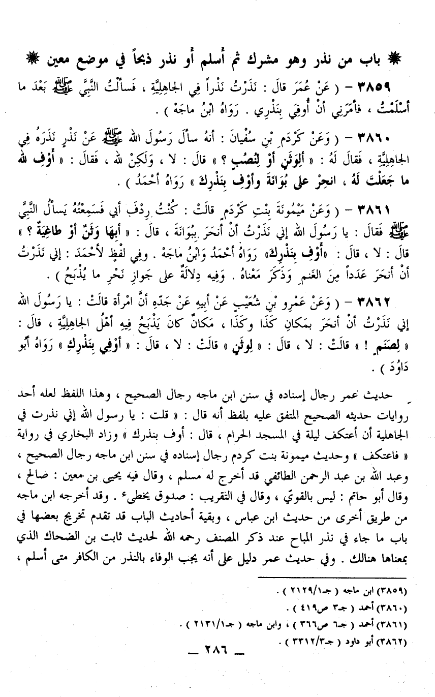 3859 - (عَنْ عُمَرَ قَالَ: «نَذَرْتُ نَذْرًا فِي الْجَاهِلِيَّةِ، فَسَأَلْتُ النَّبِيَّ - صَلَّى اللَّهُ عَلَيْهِ وَسَلَّمَ - بَعْدَ مَا أَسْلَمْتُ، فَأَمَرَنِي أَنْ أُوفِيَ بِنَذْرِي» رَوَاهُ ابْنُ مَاجَهْ)