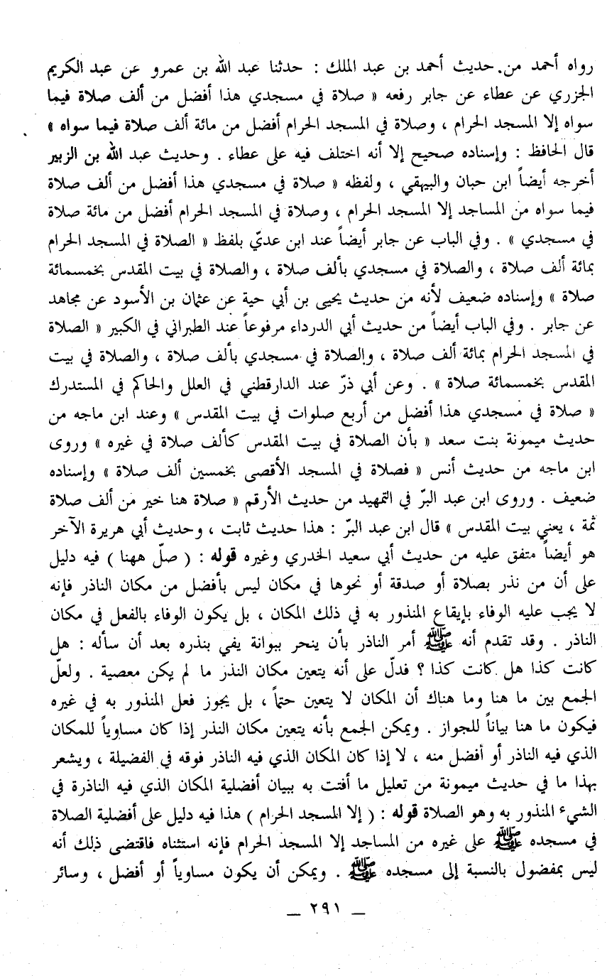 ـــــــــــــــــــــــــــــQرَوَاهُ أَحْمَدُ مِنْ حَدِيثِ أَحْمَدَ بْنِ عَبْدِ الْمَلِكِ: حَدَّثَنَا عَبْدُ اللَّهِ بْنُ عَمْرٍو عَنْ عَبْدِ الْكَرِيمِ الْجَزَرِيُّ عَنْ عَطَاءٍ عَنْ جَابِرٍ رَفَعَهُ «صَلَاةٌ فِي مَسْجِدِي هَذَا أَفْضَلُ مِنْ أَلْفِ صَلَاةٍ فِيمَا سِوَاهُ إلَّا الْمَسْجِدَ الْحَرَامَ، وَصَلَاةٌ فِي الْمَسْجِدِ الْحَرَامِ أَفْضَلُ مِنْ مِائَةِ أَلْفِ صَلَاةٍ فِيمَا سِوَاهُ» قَالَ الْحَافِظُ: وَإِسْنَادُهُ صَحِيحٌ إلَّا أَنَّهُ اُخْتُلِفَ فِيهِ عَلَى عَطَاءٍ وَحَدِيثُ عَبْدِ اللَّهِ بْنِ الزُّبَيْرِ أَخْرَجَهُ أَيْضًا ابْنُ حِبَّانَ وَالْبَيْهَقِيُّ وَلَفْظُهُ «صَلَاةٌ فِي مَسْجِدِي هَذَا أَفْضَلُ مِنْ أَلْفِ صَلَاةٍ فِيمَا سِوَاهُ مِنْ الْمَسَاجِدِ إلَّا الْمَسْجِدَ الْحَرَامَ، وَصَلَاةٌ فِي الْمَسْجِدِ الْحَرَامِ أَفْضَلُ مِنْ مِائَةِ صَلَاةٍ فِي مَسْجِدِي»