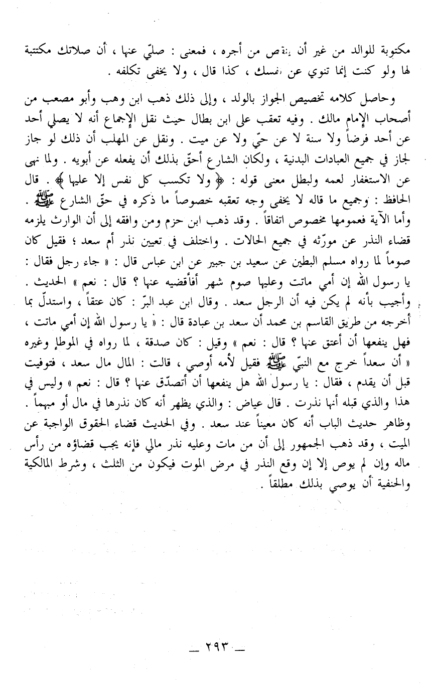 وَأُجِيبَ بِأَنَّهُ لَمْ يَكُنْ فِيهِ أَنَّ الرَّجُلَ سَعْدٌ. وَقَالَ ابْنُ عَبْدِ الْبَرِّ: كَانَ عِتْقًا، وَاسْتُدِلَّ بِمَا أَخْرَجَهُ مِنْ طَرِيقِ الْقَاسِمِ بْنِ مُحَمَّدٍ أَنَّ سَعْدَ بْنَ عُبَادَةَ قَالَ: «يَا رَسُولَ اللَّهِ إنَّ أُمِّي مَاتَتْ، فَهَلْ يَنْفَعُهَا أَنْ أُعْتِقَ عَنْهَا؟ قَالَ: نَعَمْ» وَقِيلَ: كَانَ صَدَقَةً، لِمَا رَوَاهُ فِي الْمُوَطَّأِ وَغَيْرِهِ «أَنَّ سَعْدًا خَرَجَ مَعَ النَّبِيِّ - صَلَّى اللَّهُ عَلَيْهِ وَسَلَّمَ - فَقِيلَ لِأُمِّهِ أَوْصِي، قَالَتْ: الْمَالُ مَالُ سَعْدٍ، فَتُوُفِّيَتْ قَبْلَ أَنْ يَقْدَمَ، فَقَالَ: يَا رَسُولَ اللَّهِ هَلْ يَنْفَعُهَا أَنْ أَتَصَدَّقَ عَنْهَا؟ قَالَ: نَعَمْ» وَلَيْسَ فِي هَذَا وَاَلَّذِي قَبْلَهُ أَنَّهَا نَذَرَتْ