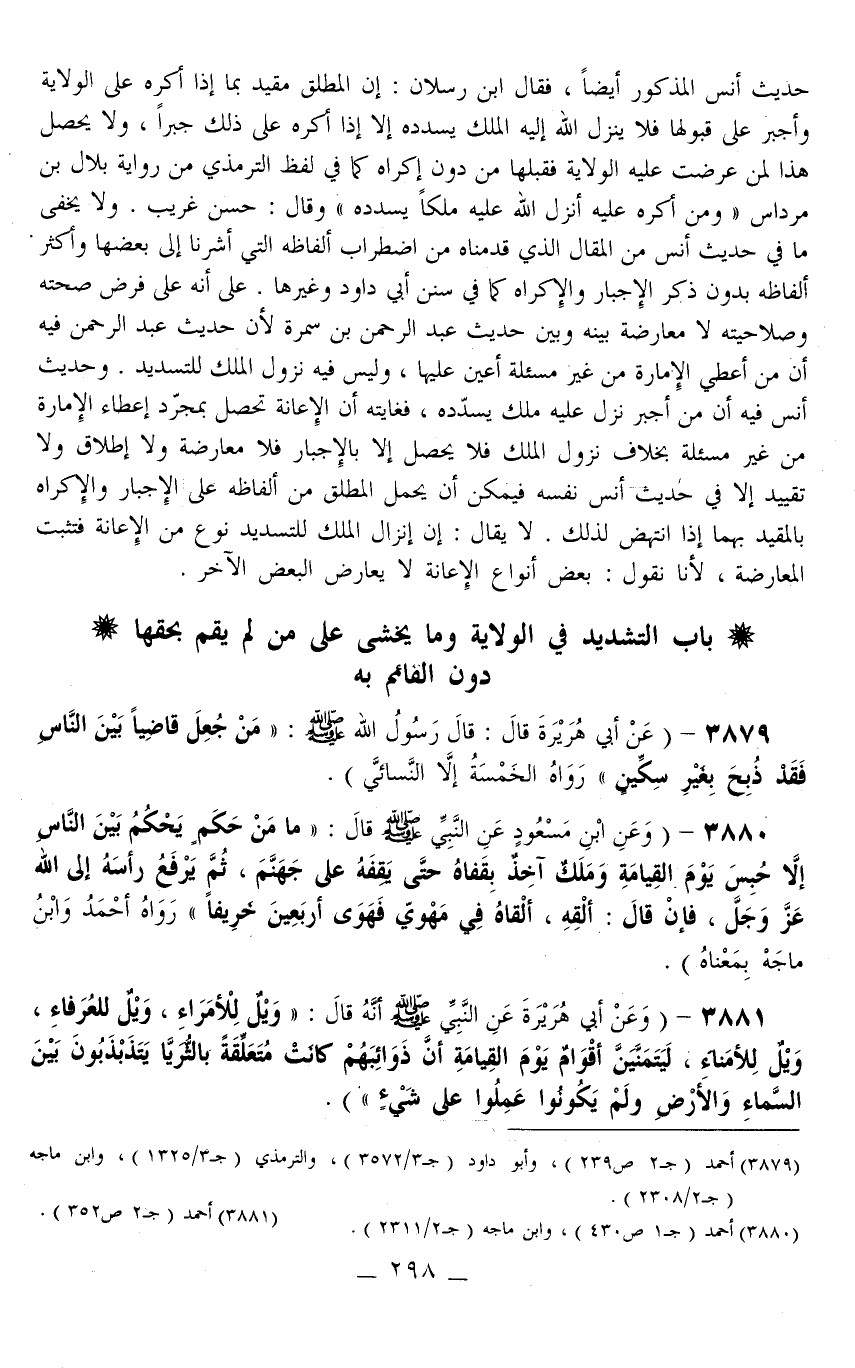 ـــــــــــــــــــــــــــــQحَدِيثُ أَنَسٍ الْمَذْكُورُ أَيْضًا، فَقَالَ ابْنُ رَسْلَانَ: إنَّ الْمُطْلَقَ مُقَيَّدٌ بِمَا إذَا أُكْرِهَ عَلَى الْوِلَايَةِ وَأُجْبِرَ عَلَى قَبُولِهَا فَلَا يُنْزِلُ اللَّهُ إلَيْهِ الْمَلَكَ يُسَدِّدُهُ إلَّا إذَا أُكْرِهَ عَلَى ذَلِكَ جَبْرًا، وَلَا يَحْصُلُ هَذَا لِمَنْ عُرِضَتْ عَلَيْهِ الْوِلَايَةُ فَقَبِلَهَا مِنْ دُونِ إكْرَاهٍ كَمَا فِي لَفْظِ التِّرْمِذِيِّ مِنْ رِوَايَةِ بِلَالِ بْنِ مِرْدَاسٍ «وَمَنْ أُكْرِهَ عَلَيْهِ أَنْزَلَ اللَّهُ عَلَيْهِ مَلَكًا يُسَدِّدُهُ» وَقَالَ: حَسَنٌ غَرِيبٌ. وَلَا يَخْفَى مَا فِي حَدِيثِ أَنَسٍ مِنْ الْمَقَالِ الَّذِي قَدَّمْنَاهُ مِنْ اضْطِرَابِ أَلْفَاظِهِ الَّتِي أَشَرْنَا إلَى بَعْضِهَا وَأَكْثَرُ أَلْفَاظِهِ بِدُونِ ذِكْرِ الْإِجْبَارِ وَالْإِكْرَاهِ كَمَا فِي سُنَنِ أَبِي دَاوُد وَغَيْرِهَا