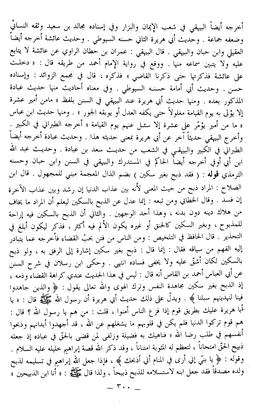 وَحَكَى ابْنُ رَسْلَانَ فِي شَرْحِ السُّنَنِ عَنْ أَبِي الْعَبَّاسِ أَحْمَدَ بْنِ الْقَاصِّ أَنَّهُ قَالَ: لَيْسَ فِي هَذَا الْحَدِيثِ عِنْدِي كَرَاهَةُ الْقَضَاءِ وَذَمِّهِ، إذْ الذَّبْحُ بِغَيْرِ سِكِّينٍ مُجَاهَدَةُ النَّفْسِ وَتَرْكُ الْهَوَى وَاَللَّهُ تَعَالَى يَقُولُ: {وَالَّذِينَ جَاهَدُوا فِينَا لَنَهْدِيَنَّهُمْ سُبُلَنَا} [العنكبوت: 69] وَيَدُلُّ عَلَى ذَلِكَ حَدِيثُ أَبِي هُرَيْرَةَ أَنَّ رَسُولَ اللَّهِ - صَلَّى اللَّهُ عَلَيْهِ وَسَلَّمَ - قَالَ: «يَا أَبَا هُرَيْرَةَ عَلَيْكَ بِطَرِيقِ قَوْمٍ إذَا فَزِعَ النَّاسُ أَمِنُوا، قُلْتُ: مَنْ هُمْ يَا رَسُولَ اللَّهِ؟ قَالَ: هُمْ قَوْمٌ تَرَكُوا الدُّنْيَا فَلَمْ يَكُنْ فِي قُلُوبِهِمْ مَا يَشْغَلُهُمْ عَنْ اللَّهِ، قَدْ أَجْهَدُوا أَبْدَانَهُمْ وَذَبَحُوا أَنْفُسَهُمْ فِي طَلَبِ رِضَا اللَّهِ» فَنَاهِيكَ بِهِ فَضِيلَةٌ وَزُلْفَى لِمَنْ قَضَى بِالْحَقِّ فِي عِبَادِهِ إذْ جَعَلَهُ ذَبِيحَ الْحَقِّ امْتِحَانًا، لِتَعْظُمَ لَهُ الْمَثُوبَةُ امْتِنَانًا، وَقَدْ ذَكَرَ اللَّهُ قِصَّةَ إبْرَاهِيمَ خَلِيلَهُ - عَلَيْهِ السَّلَامُ - وَقَوْلُهُ: {يَا بُنَيَّ إِنِّي أَرَى فِي الْمَنَامِ أَنِّي أَذْبَحُكَ} [الصافات: 102] ، فَإِذَا جَعَلَ اللَّهُ إبْرَاهِيمَ فِي تَسْلِيمِهِ لِذَبْحِ وَلَدِهِ مُصَدِّقًا فَقَدْ جَعَلَ ابْنَهُ لَاسْتِسْلَامِهِ لَلذَّبْحِ ذَبِيحًا، وَلِذَا قَالَ - صَلَّى اللَّهُ عَلَيْهِ وَسَلَّمَ -: " أَنَا ابْنُ الذَّبِيحَيْنِ "