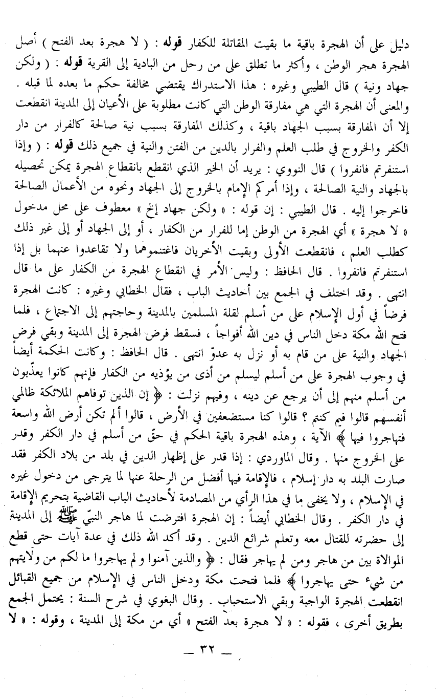 ـــــــــــــــــــــــــــــQدَلِيلٌ عَلَى أَنَّ الْهِجْرَةَ بَاقِيَةٌ مَا بَقِيَتْ الْمُقَاتَلَةُ لِلْكُفَّارِ قَوْلُهُ: (لَا هِجْرَةَ بَعْدَ الْفَتْحِ) أَصْلُ الْهِجْرَةِ هَجْرُ الْوَطَنِ، وَأَكْثَرُ مَا تُطْلَقُ عَلَى مَنْ رَحَلَ مِنْ الْبَادِيَةِ إلَى الْقَرْيَةِ قَوْلُهُ: (وَلَكِنْ جِهَادٌ وَنِيَّةٌ) قَالَ الطِّيبِيُّ وَغَيْرُهُ: هَذَا الِاسْتِدْرَاكُ يَقْتَضِي مُخَالَفَةَ حُكْمِ مَا بَعْدَهُ لِمَا قَبْلَهُ. وَالْمَعْنَى أَنَّ الْهِجْرَةَ الَّتِي هِيَ مُفَارَقَةُ الْوَطَنِ الَّتِي كَانَتْ مَطْلُوبَةً عَلَى الْأَعْيَانِ إلَى الْمَدِينَةِ انْقَطَعَتْ إلَّا أَنَّ الْمُفَارَقَةَ بِسَبَبِ الْجِهَادِ بَاقِيَةٌ، وَكَذَلِكَ الْمُفَارَقَةُ بِسَبَبِ نِيَّةٍ صَالِحَةٍ كَالْفِرَارِ مِنْ دَارِ الْكُفْرِ وَالْخُرُوجِ فِي طَلَبِ الْعِلْمِ وَالْفِرَارِ بِالدِّينِ مِنْ الْفِتَنِ وَالنِّيَّةِ فِي جَمِيعِ ذَلِكَ قَوْلُهُ: (وَإِذَا اُسْتُنْفِرْتُمْ فَانْفِرُوا) .