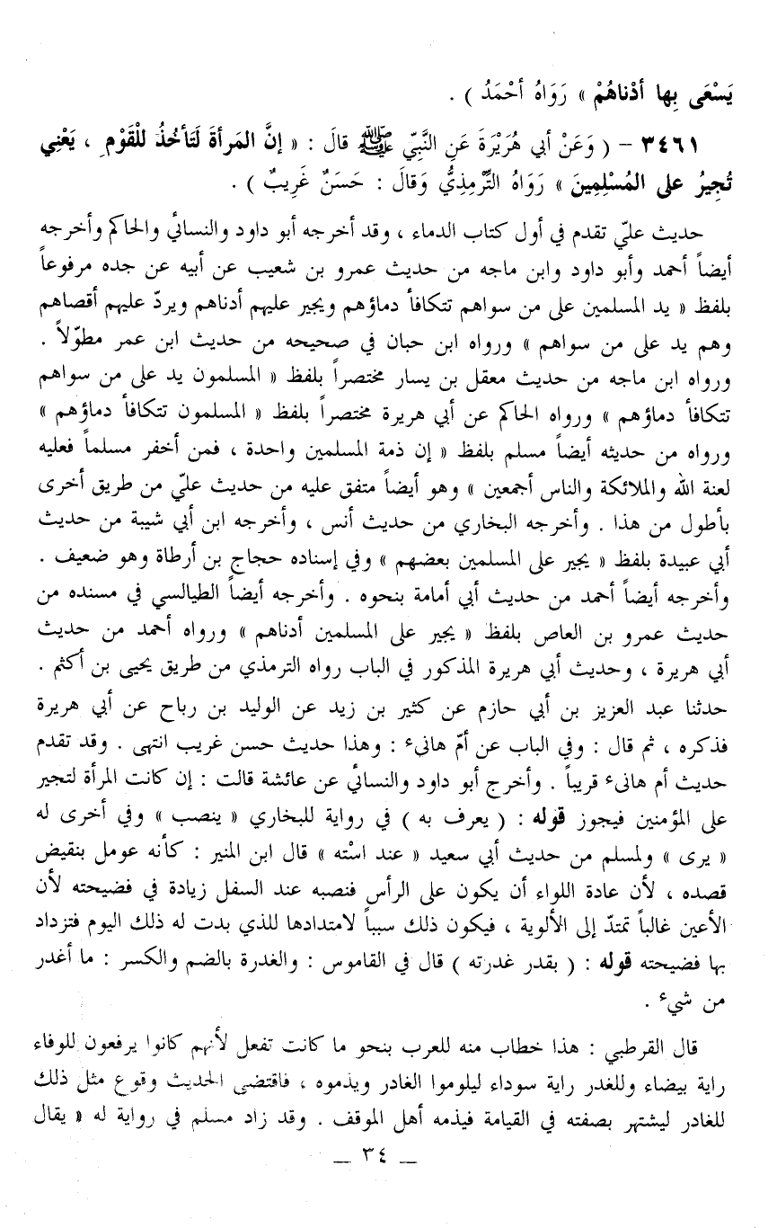 3461 - (وَعَنْ أَبِي هُرَيْرَةَ عَنْ النَّبِيِّ - صَلَّى اللَّهُ عَلَيْهِ وَسَلَّمَ - قَالَ: «إنَّ الْمَرْأَةَ لَتَأْخُذُ لِلْقَوْمِ، يَعْنِي تُجِيرُ عَلَى الْمُسْلِمِينَ» رَوَاهُ التِّرْمِذِيُّ وَقَالَ: حَسَنٌ غَرِيبٌ) .