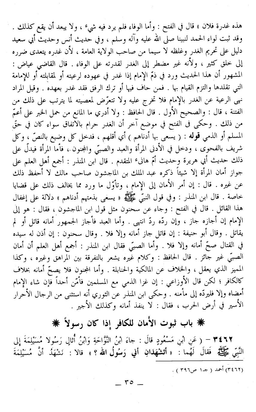 3462 - (عَنْ ابْنِ مَسْعُودٍ قَالَ: «جَاءَ ابْنُ النَّوَّاحَةِ وَابْنُ أُثَالٍ رَسُولَا مُسَيْلِمَةَ إلَى النَّبِيِّ - صَلَّى اللَّهُ عَلَيْهِ وَسَلَّمَ - فَقَالَ لَهُمَا: أَتَشْهَدَانِ أَنِّي رَسُولُ اللَّهِ؟ قَالَا: نَشْهَدُ أَنَّ مُسَيْلِمَةَ