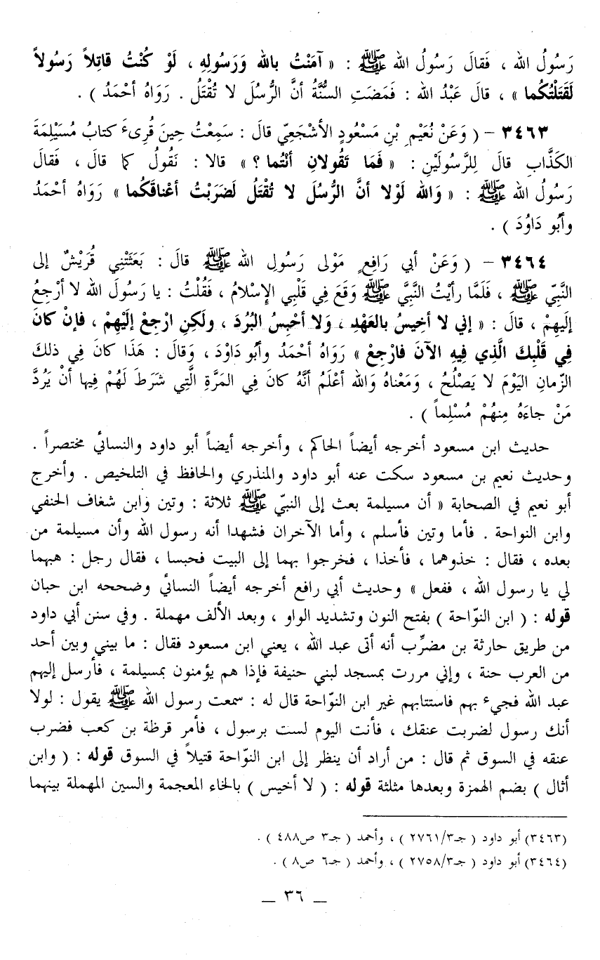 حَدِيثُ ابْنِ مَسْعُودٍ أَخْرَجَهُ أَيْضًا الْحَاكِمُ، وَأَخْرَجَهُ أَيْضًا أَبُو دَاوُد وَالنَّسَائِيُّ مُخْتَصَرًا وَحَدِيثُ نُعَيْمِ بْنِ مَسْعُودٍ سَكَتَ عَنْهُ أَبُو دَاوُد وَالْمُنْذِرِيُّ وَالْحَافِظُ فِي التَّلْخِيصِ. وَأَخْرَجَ أَبُو نُعَيْمٍ فِي الصَّحَابَةِ «أَنَّ مُسَيْلِمَةَ بَعَثَ إلَى النَّبِيِّ - صَلَّى اللَّهُ عَلَيْهِ وَسَلَّمَ - ثَلَاثَةَ: وَتِينَ وَابْنَ شِغَافِ الْحَنَفِيِّ وَابْنَ النَّوَّاحَةِ. فَأَمَّا وَتِينُ فَأَسْلَمَ، وَأَمَّا الْآخَرَانِ فَشَهِدَا أَنَّهُ رَسُولُ اللَّهِ وَأَنَّ مُسَيْلِمَةَ مِنْ بَعْدِهِ، فَقَالَ: خُذُوهُمَا، فَأُخِذَا، فَخَرَجُوا بِهِمَا إلَى الْبَيْتِ فَحُبِسَا، فَقَالَ رَجُلٌ: هَبْهُمَا لِي يَا رَسُولَ اللَّهِ، فَفَعَلَ» وَحَدِيثُ أَبِي رَافِعٍ أَخْرَجَهُ أَيْضًا النَّسَائِيّ وَصَحَّحَهُ ابْنُ حِبَّانَ.