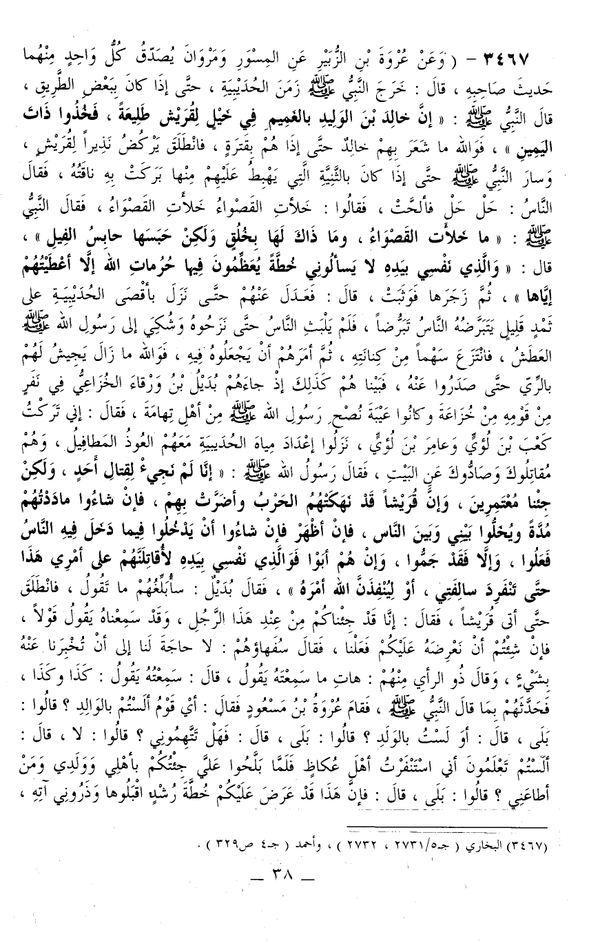 (وَعَنْ عُرْوَةَ بْنِ الزُّبَيْرِ عَنْ الْمِسْوَرِ وَمَرْوَانَ يُصَدِّقُ كُلُّ وَاحِدٍ مِنْهُمَا حَدِيثَ صَاحِبِهِ، قَالَ: «خَرَجَ النَّبِيُّ - صَلَّى اللَّهُ عَلَيْهِ وَسَلَّمَ - زَمَنَ الْحُدَيْبِيَةِ، حَتَّى إذَا كَانَ بِبَعْضِ الطَّرِيقِ، قَالَ النَّبِيُّ - صَلَّى اللَّهُ عَلَيْهِ وَسَلَّمَ -: إنَّ خَالِدَ بْنَ الْوَلِيدِ بِالْغَمِيمِ فِي خَيْلٍ لِقُرَيْشٍ طَلِيعَةً، فَخُذُوا ذَاتَ الْيَمِينِ، فَوَاَللَّهِ مَا شَعَرَ بِهِمْ خَالِدٌ حَتَّى إذَا هُمْ بِقَتَرَةٍ، فَانْطَلَقَ يَرْكُضُ نَذِيرًا لِقُرَيْشٍ، وَسَارَ النَّبِيُّ - صَلَّى اللَّهُ عَلَيْهِ وَسَلَّمَ - حَتَّى إذَا كَانَ بِالثَّنِيَّةِ الَّتِي يَهْبِطُ عَلَيْهِمْ مِنْهَا بَرَكَتْ بِهِ نَاقَتُهُ، فَقَالَ النَّاسُ: حَلْ حَلْ فَأَلَحَّتْ، فَقَالُوا: خَلَأَتْ الْقَصْوَاءُ خَلَأَتْ الْقَصْوَاءُ، فَقَالَ النَّبِيُّ - صَلَّى اللَّهُ عَلَيْهِ وَسَلَّمَ -: مَا خَلَأَتْ الْقَصْوَاءُ، وَمَا ذَاكَ لَهَا بِخُلُقٍ وَلَكِنْ حَبَسَهَا حَابِسُ الْفِيلِ، قَالَ: وَاَلَّذِي نَفْسِي بِيَدِهِ لَا يَسْأَلُونِي خُطَّةً يُعَظِّمُونَ فِيهَا حُرُمَاتِ اللَّهِ إلَّا أَعْطَيْتُهُمْ إيَّاهَا، ثُمَّ زَجَرَهَا فَوَثَبَتْ، قَالَ: فَعَدَلَ عَنْهُمْ حَتَّى نَزَلَ بِأَقْصَى الْحُدَيْبِيَةِ عَلَى ثَمْدٍ قَلِيلٍ يَتَبَرَّضُهُ النَّاسُ تَبَرُّضًا، فَلَمْ يَلْبَثْ النَّاسُ حَتَّى نَزَحُوهُ وَشُكِيَ إلَى رَسُولِ اللَّهِ - صَلَّى اللَّهُ عَلَيْهِ وَسَلَّمَ - الْعَطَشُ، فَانْتَزَعَ سَهْمًا مِنْ كِنَانَتِهِ، ثُمَّ أَمَرَهُمْ أَنْ يَجْعَلُوهُ فِيهِ، فَوَاَللَّهِ مَا زَالَ يَجِيشُ لَهُمْ بِالرِّيِّ حَتَّى صَدَرُوا عَنْهُ، فَبَيْنَا هُمْ كَذَلِكَ إذْ جَاءَهُمْ بُدَيْلُ بْنُ وَرْقَاءَ الْخُزَاعِيُّ فِي نَفَرٍ مِنْ قَوْمِهِ مِنْ خُزَاعَةَ وَكَانُوا عَيْبَةَ نُصْحِ رَسُولِ اللَّهِ - صَلَّى اللَّهُ عَلَيْهِ وَسَلَّمَ - مِنْ أَهْلِ تِهَامَةَ، فَقَالَ: إنِّي تَرَكْت كَعْبَ بْنِ لُؤَيٍّ وَعَامِرَ بْنِ لُؤَيٍّ، نَزَلُوا إعْدَادَ مِيَاهِ الْحُدَيْبِيَةِ مَعَهُمْ الْعُوذُ الْمَطَافِيلُ، وَهُمْ مُقَاتِلُوك وَصَادُّوك عَنْ الْبَيْتِ، فَقَالَ رَسُولُ اللَّهِ - صَلَّى اللَّهُ عَلَيْهِ وَسَلَّمَ -: إنَّا لَمْ نَجِئْ لِقِتَالِ أَحَدٍ، وَلَكِنْ جِئْنَا مُعْتَمِرِينَ، وَإِنَّ قُرَيْشًا قَدْ نَهِكَتْهُمْ الْحَرْبُ وَأَضَرَّتْ بِهِمْ، فَإِنْ شَاءُوا مَادَدْتُهُمْ مُدَّةً وَيُخَلُّوا بَيْنِي وَبَيْنَ النَّاسِ، فَإِنْ أَظْهَرْ فَإِنْ شَاءُوا أَنْ يَدْخُلُوا فِيمَا دَخَلَ فِيهِ النَّاسُ فَعَلُوا، وَإِلَّا فَقَدْ جَمُّوا، وَإِنْ هُمْ أَبَوْا فَوَاَلَّذِي نَفْسِي بِيَدِهِ لَأُقَاتِلَنَّهُمْ عَلَى أَمْرِي هَذَا حَتَّى تَنْفَرِدَ سَالِفَتِي، أَوْ لَيُنْفِذَنَّ اللَّهُ أَمْرَهُ، فَقَالَ بُدَيْلُ: سَأُبَلِّغُهُمْ مَا تَقُولُ، فَانْطَلَقَ حَتَّى أَتَى قُرَيْشًا، فَقَالَ: إنَّا قَدْ جِئْنَاكُمْ مِنْ عِنْدِ هَذَا الرَّجُلِ، وَقَدْ سَمِعْنَاهُ يَقُولُ قَوْلًا، فَإِنْ شِئْتُمْ أَنْ نَعْرِضَهُ عَلَيْكُمْ فَعَلْنَا، فَقَالَ سُفَهَاؤُهُمْ: لَا حَاجَةَ لَنَا إلَى أَنْ تُخْبِرَنَا عَنْهُ بِشَيْءٍ، وَقَالَ ذُو الرَّأْيِ مِنْهُمْ: هَاتِ مَا سَمِعْتَهُ يَقُولُ، قَالَ: سَمِعْتُهُ يَقُولُ: كَذَا وَكَذَا، فَحَدَّثَهُمْ بِمَا قَالَ النَّبِيُّ - صَلَّى اللَّهُ عَلَيْهِ وَسَلَّمَ - فَقَامَ عُرْوَةُ بْنُ مَسْعُودٍ فَقَالَ: أَيْ قَوْمُ أَلَسْتُمْ بِالْوَالِدِ؟ قَالُوا: بَلَى، قَالَ: أَوْ لَسْت بِالْوَلَدِ؟ قَالُوا: بَلَى، قَالَ: فَهَلْ تَتَّهِمُونِي؟ قَالُوا: لَا، قَالَ: أَلَسْتُمْ تَعْلَمُونَ أَنِّي اسْتَنْفَرْت أَهْلَ عُكَاظٍ فَلَمَّا بَلَّحُوا عَلَيَّ جِئْتُكُمْ بِأَهْلِي وَوَلَدِي وَمَ