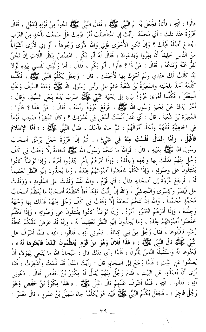قَالُوا: ائْتِهِ، فَأَتَاهُ فَجَعَلَ يُكَلِّمُ النَّبِيَّ - صَلَّى اللَّهُ عَلَيْهِ وَسَلَّمَ -، فَقَالَ النَّبِيُّ - صَلَّى اللَّهُ عَلَيْهِ وَسَلَّمَ - نَحْوًا مِنْ قَوْلِهِ لِبُدَيْلٍ، فَقَالَ عُرْوَةُ عِنْدَ ذَلِكَ: أَيْ مُحَمَّدُ أَرَأَيْتَ إنْ اسْتَأْصَلْت أَمْرَ قَوْمِك هَلْ سَمِعْت بِأَحَدٍ مِنْ الْعَرَبِ اجْتَاحَ أَصْلَهُ قَبْلَك؟ وَإِنْ تَكُنْ الْأُخْرَى فَإِنِّي وَاَللَّهِ لَأَرَى وُجُوهًا، أَوْ إنِّي لَأَرَى أَشْوَابًا مِنْ النَّاسِ خَلِيقًا أَنْ يَفِرُّوا وَيَدَعُوك، فَقَالَ لَهُ أَبُو بَكْرٍ: اُمْصُصْ بِبَظْرِ اللَّاتِ إنْ نَحْنُ نَفِرُّ عَنْهُ وَنَدَعُهُ، فَقَالَ: مَنْ ذَا؟ قَالُوا: أَبُو بَكْرٍ، فَقَالَ: أَمَا وَاَلَّذِي نَفْسِي بِيَدِهِ لَوْلَا يَدٌ كَانَتْ لَك عِنْدِي وَلَمْ أَجْزِك بِهَا لَأَجَبْتُكَ، قَالَ: وَجَعَلَ يُكَلِّمُ النَّبِيَّ - صَلَّى اللَّهُ عَلَيْهِ وَسَلَّمَ - فَكُلَّمَا كَلَّمَهُ أَخَذَ بِلِحْيَتِهِ وَالْمُغِيرَةُ بْنُ شُعْبَةَ قَائِمٌ عَلَى رَأْسِ رَسُولِ اللَّهِ - صَلَّى اللَّهُ عَلَيْهِ وَسَلَّمَ - وَمَعَهُ السَّيْفُ وَعَلَيْهِ الْمِغْفَرُ، فَكُلَّمَا أَهْوَى عُرْوَةُ بِيَدِهِ إلَى لِحْيَةِ النَّبِيِّ - صَلَّى اللَّهُ عَلَيْهِ وَسَلَّمَ - ضَرَبَ يَدَهُ بِنَعْلِ السَّيْفِ وَقَالَ: أَخِّرْ يَدَك عَنْ لِحْيَةِ رَسُولِ اللَّهِ - صَلَّى اللَّهُ عَلَيْهِ وَسَلَّمَ - فَرَفَعَ عُرْوَةُ رَأْسَهُ، فَقَالَ: مَنْ هَذَا؟ قَالُوا: الْمُغِيرَةُ بْنُ شُعْبَةَ، قَالَ: أَيْ غُدَرُ أَلَسْت أَسْعَى فِي غَدْرَتِك؟ وَكَانَ الْمُغِيرَةُ صَحِبَ قَوْمًا فِي الْجَاهِلِيَّةِ قَتَلَهُمْ وَأَخَذَ أَمْوَالَهُمْ، ثُمَّ جَاءَ فَأَسْلَمَ، فَقَالَ النَّبِيُّ - صَلَّى اللَّهُ عَلَيْهِ وَسَلَّمَ -: أَمَّا الْإِسْلَامُ فَأَقْبَلُ، وَأَمَّا الْمَالُ فَلَسْت مِنْهُ فِي شَيْءٍ. ثُمَّ إنَّ عُرْوَةَ جَعَلَ يَرْمُقُ أَصْحَابَ رَسُولِ اللَّهِ - صَلَّى اللَّهُ عَلَيْهِ وَسَلَّمَ - بِعَيْنِهِ، قَالَ: فَوَاَللَّهِ مَا تَنَخَّمَ رَسُولُ اللَّهِ - صَلَّى اللَّهُ عَلَيْهِ وَسَلَّمَ - نُخَامَةً إلَّا وَقَعَتْ فِي كَفِّ رَجُلٍ مِنْهُمْ فَدَلَّك بِهَا وَجْهَهُ وَجِلْدَهُ، وَإِذَا أَمَرَهُمْ بِأَمْرٍ ابْتَدَرُوا أَمْرَهُ، وَإِذَا تَوَضَّأَ كَادُوا يَقْتَتِلُونَ عَلَى وَضُوئِهِ، وَإِذَا تَكَلَّمَ خَفَضُوا أَصْوَاتَهُمْ عِنْدَهُ، وَمَا يُحِدُّونَ إلَيْهِ النَّظَرَ تَعْظِيمًا لَهُ، فَرَجَعَ عُرْوَةُ إلَى أَصْحَابِهِ فَقَالَ: أَيْ قَوْمُ، وَاَللَّهِ لَقَدْ وَفَدْت عَلَى الْمُلُوكِ، وَوَفَدْت عَلَى قَيْصَرَ وَكِسْرَى وَالنَّجَاشِيِّ، وَاَللَّهِ إنْ رَأَيْت مَلِكًا قَطُّ تُعَظِّمُهُ أَصْحَابُهُ مَا يُعَظِّمُ أَصْحَابُ مُحَمَّدٍ مُحَمَّدًا، وَاَللَّهِ إنْ تَنَخَّمَ نُخَامَةً إلَّا وَقَعَتْ فِي كَفِّ رَجُلٍ مِنْهُمْ فَدَلَّك بِهَا وَجْهَهُ وَجِلْدَهُ، وَإِذَا أَمَرَهُمْ ابْتَدَرُوا أَمْرَهُ، وَإِذَا تَوَضَّأَ كَادُوا يَقْتَتِلُونَ عَلَى وَضُوئِهِ، وَإِذَا تَكَلَّمَ خَفَضُوا أَصْوَاتَهُمْ عِنْدَهُ، وَمَا يُحِدُّونَ إلَيْهِ النَّظَرَ تَعْظِيمًا لَهُ، وَإِنَّهُ قَدْ عَرَضَ عَلَيْكُمْ خُطَّةَ رُشْدٍ فَاقْبَلُوهَا، فَقَالَ رَجُلٌ مِنْ بَنِي كِنَانَةَ. دَعُونِي آتِهِ، فَقَالُوا: ائْتِهِ، فَلَمَّا أَشْرَفَ عَلَى النَّبِيِّ - صَلَّى اللَّهُ عَلَيْهِ وَسَلَّمَ - قَالَ النَّبِيُّ - صَلَّى اللَّهُ عَلَيْهِ وَسَلَّمَ -: هَذَا فُلَانٌ وَهُوَ مِنْ قَوْمٍ يُعَظِّمُونَ الْبُدْنَ فَابْعَثُوهَا لَهُ، فَبَعَثُوهَا لَهُ وَاسْتَقْبَلَهُ النَّاسُ يُلَبُّونَ، فَلَمَّا رَأَى ذَلِكَ قَالَ: سُبْحَانَ اللَّهِ مَا يَنْبَغِي لِهَؤُلَاءِ أَنْ يُصَدُّوا عَنْ الْبَيْتِ، فَلَمَّا رَجَعَ إلَى أَصْحَابِهِ قَالَ: رَأ