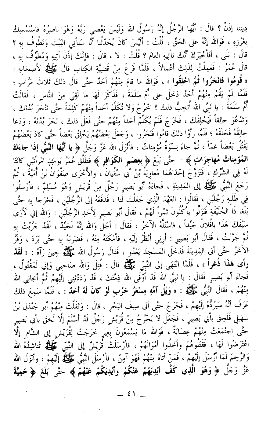 دِينِنَا إذَنْ؟ قَالَ: أَيُّهَا الرَّجُلُ إنَّهُ رَسُولُ اللَّهِ وَلَيْسَ يَعْصِي رَبَّهُ وَهُوَ نَاصِرُهُ فَاسْتَمْسِكْ بِغَرْزِهِ، فَوَاَللَّهِ إنَّهُ عَلَى الْحَقِّ، قُلْتُ: أَلَيْسَ كَانَ يُحَدِّثُنَا أَنَا سَنَأْتِي الْبَيْتَ وَنَطُوفُ بِهِ؟ قَالَ: بَلَى، أَفَأَخْبَرَك أَنَّك تَأْتِيهِ الْعَامَ؟ قُلْتُ: لَا، قَالَ: فَإِنَّك إذَنْ آتِيهِ وَمُطَوِّفٌ بِهِ، قَالَ عُمَرُ: فَعَمِلْتُ لِذَلِكَ أَعْمَالًا، فَلَمَّا فَرَغَ مِنْ قَضِيَّةِ الْكِتَابِ قَالَ - صَلَّى اللَّهُ عَلَيْهِ وَسَلَّمَ - لِأَصْحَابِهِ: قُومُوا فَانْحَرُوا ثُمَّ احْلِقُوا، فَوَاَللَّهِ مَا قَامَ مِنْهُمْ أَحَدٌ حَتَّى قَالَ ذَلِكَ ثَلَاثَ مَرَّاتٍ، فَلَمَّا لَمْ يَقُمْ مِنْهُمْ أَحَدٌ دَخَلَ عَلَى أُمِّ سَلَمَةَ، فَذَكَرَ لَهَا مَا لَقِيَ مِنْ النَّاسِ، فَقَالَتْ أُمُّ سَلَمَةَ: يَا نَبِيَّ اللَّه أَتُحِبُّ ذَلِكَ؟ اُخْرُجْ وَلَا تُكَلِّمْ أَحَدًا مِنْهُمْ كَلِمَةً حَتَّى تَنْحَرَ بُدْنَكَ، وَتَدْعُوَ حَالِقًا فَيَحْلِقَك، فَخَرَجَ فَلَمْ يُكَلِّمْ أَحَدًا مِنْهُمْ حَتَّى فَعَلَ ذَلِكَ، نَحَرَ، وَدَعَا حَالِقَهُ فَحَلَقَهُ، فَلَمَّا رَأَوْا ذَلِكَ قَامُوا فَنَحَرُوا، وَجَعَلَ بَعْضُهُمْ يَحْلِقُ بَعْضًا حَتَّى كَادَ بَعْضُهُمْ يَقْتُلُ بَعْضًا غَمًّا، ثُمَّ جَاءَ نِسْوَةٌ مُؤْمِنَاتٌ، فَأَنْزَلَ اللَّهُ عَزَّ وَجَلَّ {يَا أَيُّهَا الَّذِينَ آمَنُوا إِذَا جَاءَكُمُ الْمُؤْمِنَاتُ مُهَاجِرَاتٍ} [الممتحنة: 10]- حَتَّى بَلَغَ {بِعِصَمِ الْكَوَافِرِ} [الممتحنة: 10] فَطَلَّقَ عُمَرُ يَوْمَئِذٍ امْرَأَتَيْنِ كَانَتَا لَهُ فِي الشِّرْكِ، فَتَزَوَّجَ إحْدَاهُمَا مُعَاوِيَةُ بْنُ أَبِي سُفْيَانَ، وَالْأُخْرَى صَفْوَانُ بْنُ أُمَيَّةَ، ثُمَّ رَجَعَ النَّبِيُّ - صَلَّى اللَّهُ عَلَيْهِ وَسَلَّمَ - إلَى الْمَدِينَةِ، فَجَاءَهُ أَبُو بَصِيرٍ رَجُلٌ مِنْ قُرَيْشٍ وَهُوَ مُسْلِمٌ، فَأَرْسَلُوا فِي طَلَبِهِ رَجُلَيْنِ، فَقَالُوا: الْعَهْدَ الَّذِي جَعَلْتَ لَنَا، فَدَفَعَهُ إلَى الرَّجُلَيْنِ، فَخَرَجَا بِهِ حَتَّى بَلَغَا ذَا الْحُلَيْفَةِ فَنَزَلُوا يَأْكُلُونَ تَمْرًا لَهُمْ، فَقَالَ أَبُو بَصِيرٍ لِأَحَدِ الرَّجُلَيْنِ: وَاَللَّهِ إنِّي لَأَرَى سَيْفَكَ هَذَا يَا فُلَانُ جَيِّدًا، فَاسْتَلَّهُ الْآخَرُ، فَقَالَ: أَجَلْ وَاَللَّهِ إنَّهُ لَجَيِّدٌ، لَقَدْ جَرَّبْت بِهِ ثُمَّ جَرَّبْت، فَقَالَ أَبُو بَصِيرٍ: أَرِنِي أَنْظُرْ إلَيْهِ، فَأَمْكَنَهُ مِنْهُ، فَضَرَبَهُ بِهِ حَتَّى بَرَدَ، وَفَرَّ الْآخَرُ حَتَّى أَتَى الْمَدِينَةَ فَدَخَلَ الْمَسْجِدَ يَعْدُو، فَقَالَ رَسُولُ اللَّه - صَلَّى اللَّهُ عَلَيْهِ وَسَلَّمَ - حِينَ رَآهُ: لَقَدْ رَأَى هَذَا ذُعْرًا، فَلَمَّا انْتَهَى إلَى النَّبِيِّ - صَلَّى اللَّهُ عَلَيْهِ وَسَلَّمَ - قَالَ: قُتِلَ وَاَللَّهِ صَاحِبِي وَإِنِّي لَمَقْتُولٌ، فَجَاءَ أَبُو بَصِيرٍ فَقَالَ: يَا نَبِيَّ اللَّهِ قَدْ أَوْفَى اللَّهُ ذِمَّتَك، قَدْ رَدَدْتَنِي إلَيْهِمْ ثُمَّ أَنْجَانِي اللَّهُ مِنْهُمْ، فَقَالَ النَّبِيُّ - صَلَّى اللَّهُ عَلَيْهِ وَسَلَّمَ -: وَيْلُ أُمِّهِ مِسْعَرُ حَرْبٍ لَوْ كَانَ لَهُ أَحَدٌ، فَلَمَّا سَمِعَ ذَلِكَ عَرَفَ أَنَّهُ سَيَرُدُّهُ إلَيْهِمْ، فَخَرَجَ حَتَّى أَتَى الْبَحْرَ، قَالَ: وَتَفَلَّتَ مِنْهُمْ أَبُو جَنْدَلِ بْنِ سُهَيْلٍ فَلَحِقَ بِأَبِي بَصِيرٍ، فَجَعَلَ لَا يَخْرُجُ مِنْ قُرَيْشٍ رَجُلٌ قَدْ أَسْلَمَ إلَّا لَحِقَ بِأَبِي بَصِيرٍ حَتَّى اجْتَمَعَتْ مِنْهُمْ عِصَابَةٌ، فَوَاَللَّهِ مَا يَسْمَعُونَ بِعِيرٍ خَرَجَتْ لِقُرَيْشٍ إلَى الشَّامِ إلَّا اعْتَرَضُوا لَهَا، فَقَتَلُوهُمْ وَأَخَذُوا أَمْوَالَهُمْ، فَأَرْسَلَتْ قُرَيْشٌ إلَى النَّبِيِّ - ص