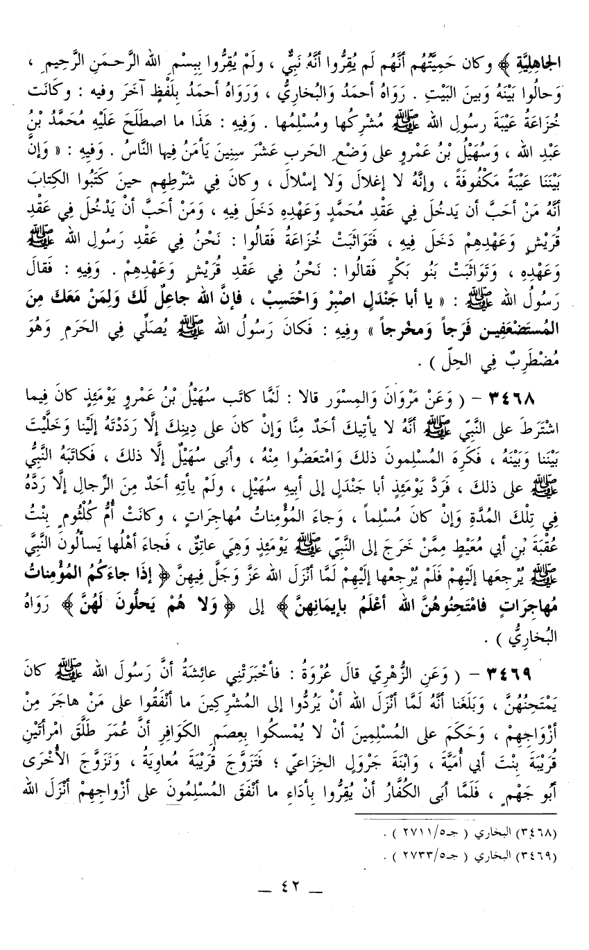 وَكَانَ حَمِيَّتُهُمْ أَنَّهُمْ لَمْ يُقِرُّوا أَنَّهُ نَبِيٌّ، وَلَمْ يُقِرُّوا بِبِسْمِ اللَّهِ الرَّحْمَنِ الرَّحِيمِ، وَحَالُوا بَيْنَهُ وَبَيْنَ الْبَيْتِ» رَوَاهُ أَحْمَدُ وَالْبُخَارِيُّ. وَرَوَاهُ أَحْمَدُ بِلَفْظٍ آخَرَ وَفِيهِ: «وَكَانَتْ خُزَاعَةُ عَيْبَةَ رَسُولِ اللَّهِ - صَلَّى اللَّهُ عَلَيْهِ وَسَلَّمَ - مُشْرِكُهَا وَمُسْلِمُهَا. وَفِيهِ: هَذَا مَا اصْطَلَحَ عَلَيْهِ مُحَمَّدُ بْنُ عَبْدِ اللَّهِ، وَسُهَيْلُ بْنُ عَمْرٍو عَلَى وَضْعِ الْحَرْبِ عَشْرَ سِنِينَ يَأْمَنُ فِيهَا النَّاسُ. وَفِيهِ: وَإِنَّ بَيْنَنَا عَيْبَةً مَكْفُوفَةً، وَإِنَّهُ لَا إغْلَالَ وَلَا إسْلَالَ، وَكَانَ فِي شَرْطِهِمْ حِينَ كَتَبُوا الْكِتَابَ أَنَّهُ مَنْ أَحَبَّ أَنْ يَدْخُلَ فِي عَقْدِ مُحَمَّدٍ وَعَهْدِهِ دَخَلَ فِيهِ، وَمَنْ أَحَبَّ أَنْ يَدْخُلَ فِي عَقْدِ قُرَيْشٍ وَعَهْدِهِمْ دَخَلَ فِيهِ، فَتَوَاثَبَتْ خُزَاعَةُ فَقَالُوا: نَحْنُ فِي عَقْدِ رَسُولِ اللَّهِ - صَلَّى اللَّهُ عَلَيْهِ وَسَلَّمَ - وَعَهْدِهِ، وَتَوَاثَبَتْ بَنُو بَكْرٍ فَقَالُوا: نَحْنُ فِي عَقْدِ قُرَيْشٍ وَعَهْدِهِمْ. وَفِيهِ: فَقَالَ رَسُولُ اللَّهِ - صَلَّى اللَّهُ عَلَيْهِ وَسَلَّمَ -: يَا أَبَا جَنْدَلٍ اصْبِرْ وَاحْتَسِبْ، فَإِنَّ اللَّهَ جَاعِلٌ لَك وَلِمَنْ مَعَكَ مِنْ الْمُسْتَضْعَفِينَ فَرَجًا وَمَخْرَجًا وَفِيهِ: فَكَانَ رَسُولُ اللَّهِ - صَلَّى اللَّهُ عَلَيْهِ وَسَلَّمَ - يُصَلِّي فِي الْحَرَمِ وَهُوَ مُضْطَرِبٌ فِي الْحِلِّ» ) .