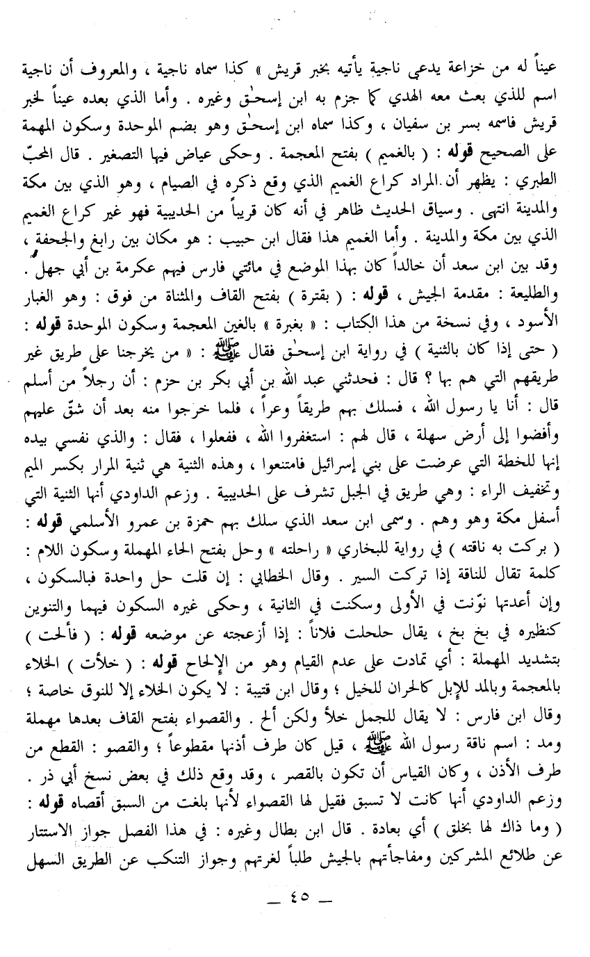 وَالْقَصْوَاءُ بِفَتْحِ الْقَافِ بَعْدَهَا مُهْمَلَةٌ وَمَدٌّ: اسْمُ نَاقَةِ رَسُولِ اللَّهِ - صَلَّى اللَّهُ عَلَيْهِ وَسَلَّمَ - قِيلَ كَانَ طَرَفُ أُذُنِهَا مَقْطُوعًا، وَالْقَصْوُ: الْقَطْعُ مِنْ طَرَفِ الْأُذُنِ، وَكَانَ الْقِيَاسُ أَنْ تَكُونَ بِالْقَصْرِ، وَقَدْ وَقَعَ ذَلِكَ فِي بَعْضِ نُسَخِ أَبِي ذَرٍّ. وَزَعَمَ الدَّاوُدِيُّ أَنَّهَا كَانَتْ لَا تُسْبَقُ فَقِيلَ لَهَا الْقَصْوَاءُ لِأَنَّهَا بَلَغَتْ مِنْ السَّبْقِ أَقْصَاهُ قَوْلُهُ: (وَمَا ذَاكَ لَهَا بِخُلُقٍ) أَيْ بِعَادَةٍ. قَالَ ابْنُ بَطَّالٍ وَغَيْرُهُ: فِي هَذَا الْفَصْلِ جَوَازُ الِاسْتِتَارِ عَنْ طَلَائِعِ الْمُشْرِكِينَ وَمُفَاجَأَتِهِمْ بِالْجَيْشِ طَلَبًا لِغِرَّتِهِمْ وَجَوَازُ التَّنَكُّبِ عَنْ الطَّرِيقِ السَّهْلِ