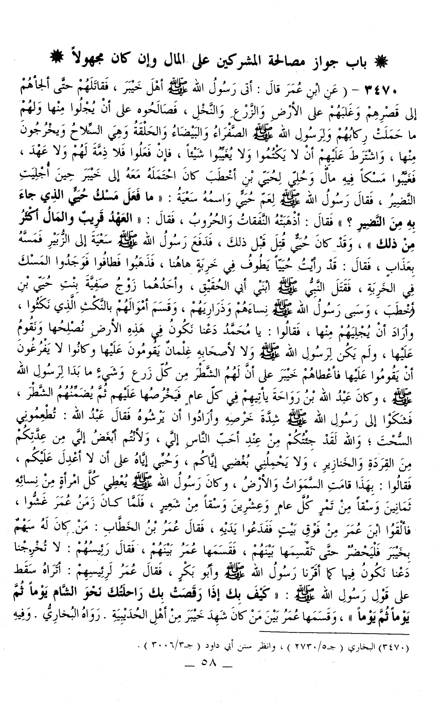بَابُ جَوَازِ مُصَالَحَةِ الْمُشْرِكِينَ عَلَى الْمَالِ وَإِنْ كَانَ مَجْهُولًا (عَنْ ابْنِ عُمَرَ قَالَ: «أَتَى رَسُولُ اللَّهِ - صَلَّى اللَّهُ عَلَيْهِ وَسَلَّمَ - أَهْلَ خَيْبَرَ، فَقَاتَلَهُمْ حَتَّى أَلْجَأَهُمْ إلَى قَصْرِهِمْ وَغَلَبَهُمْ عَلَى الْأَرْضِ وَالزَّرْعِ وَالنَّخْلِ، فَصَالَحُوهُ عَلَى أَنْ يُجْلُوا مِنْهَا وَلَهُمْ مَا حَمَلَتْ رِكَابُهُمْ وَلِرَسُولِ اللَّهِ - صَلَّى اللَّهُ عَلَيْهِ وَسَلَّمَ - الصَّفْرَاءُ وَالْبَيْضَاءُ وَالْحَلْقَةُ وَهِيَ السِّلَاحُ وَيَخْرُجُونَ مِنْهَا، وَاشْتَرَطَ عَلَيْهِمْ أَنْ لَا يَكْتُمُوا وَلَا يُغَيِّبُوا شَيْئًا، فَإِنْ فَعَلُوا فَلَا ذِمَّةَ لَهُمْ وَلَا عَهْدَ، فَغَيَّبُوا مَسْكًا فِيهِ مَالٌ وَحُلِيٌّ لِحُيَيِّ بْنِ أَخْطَبَ كَانَ احْتَمَلَهُ مَعَهُ إلَى خَيْبَرَ حِينَ أُجْلِيَتْ النَّضِيرُ، فَقَالَ رَسُولُ اللَّهِ - صَلَّى اللَّهُ عَلَيْهِ وَسَلَّمَ - لِعَمِّ حُيَيِّ وَاسْمُهُ سَعْيَةُ: مَا فَعَلَ مَسْكُ حُيَيِّ الَّذِي جَاءَ بِهِ مِنْ النَّضِيرِ؟ فَقَالَ: أَذْهَبَتْهُ النَّفَقَاتُ وَالْحُرُوبُ، فَقَالَ: الْعَهْدُ قَرِيبٌ وَالْمَالُ أَكْثَرُ مِنْ ذَلِكَ. وَقَدْ كَانَ حُيَيِّ قُتِلَ قَبْلَ ذَلِكَ، فَدَفَعَ رَسُولُ اللَّهِ - صَلَّى اللَّهُ عَلَيْهِ وَسَلَّمَ - سَعْيَةَ إلَى الزُّبَيْرِ فَمَسَّهُ بِعَذَابٍ، فَقَالَ: قَدْ رَأَيْتُ حُيَيًّا يَطُوفُ فِي خَرِبَةٍ هَاهُنَا، فَذَهَبُوا فَطَافُوا فَوَجَدُوا الْمَسْكَ فِي الْخَرِبَةِ، فَقَتَلَ النَّبِيُّ - صَلَّى اللَّهُ عَلَيْهِ وَسَلَّمَ - ابْنَيْ أَبِي الْحُقَيْقِ، وَأَحَدُهُمَا زَوْجُ صَفِيَّةَ بِنْتِ حُيَيِّ بْنِ أَخْطَبَ، وَسَبَى رَسُولُ اللَّهِ - صَلَّى اللَّهُ عَلَيْهِ وَسَلَّمَ - نِسَاءَهُمْ وَذَرَارِيَّهُمْ، وَقَسَمَ أَمْوَالَهُمْ بِالنَّكْثِ الَّذِي نَكَثُوا، وَأَرَادَ أَنْ يُجْلِيَهُمْ مِنْهَا، فَقَالُوا: يَا مُحَمَّدُ دَعْنَا نَكُونُ فِي هَذِهِ الْأَرْضِ نُصْلِحُهَا وَنَقُومُ عَلَيْهَا، وَلَمْ يَكُنْ لِرَسُولِ اللَّهِ - صَلَّى اللَّهُ عَلَيْهِ وَسَلَّمَ - وَلَا لِأَصْحَابِهِ غِلْمَانٌ يَقُومُونَ عَلَيْهَا وَكَانُوا لَا يَفْرُغُونَ أَنْ يَقُومُوا عَلَيْهَا فَأَعْطَاهُمْ خَيْبَرَ عَلَى أَنَّ لَهُمْ الشَّطْرَ مِنْ كُلِّ زَرْعٍ وَشَيْءٍ مَا بَدَا لِرَسُولِ اللَّهِ - صَلَّى اللَّهُ عَلَيْهِ وَسَلَّمَ - وَكَانَ عَبْدُ اللَّهِ بْنُ رَوَاحَةَ يَأْتِيهِمْ فِي كُلِّ عَامٍ فَيَخْرُصُهَا عَلَيْهِمْ ثُمَّ يُضَمِّنُهُمْ الشَّطْرَ، فَشَكَّوْا إلَى رَسُولِ اللَّه - صَلَّى اللَّهُ عَلَيْهِ وَسَلَّمَ - شِدَّةَ خَرْصِهِ وَأَرَادُوا أَنْ يَرْشُوهُ فَقَالَ عَبْدُ اللَّهِ: تُطْعِمُونِي السُّحْتَ، وَاَللَّهِ لَقَدْ جِئْتُكُمْ مِنْ عِنْدِ أَحَبِّ النَّاسِ إلَيَّ، وَلَأَنْتُمْ أَبْغَضُ إلَيَّ مِنْ عِدَّتِكُمْ مِنْ الْقِرَدَةِ وَالْخَنَازِيرِ، وَلَا يَحْمِلُنِي بُغْضِي إيَّاكُمْ، وَحُبِّي إيَّاهُ عَلَى أَنْ لَا أَعْدِلَ عَلَيْكُمْ، فَقَالُوا: بِهَذَا قَامَتْ السَّمَوَاتُ وَالْأَرْضُ، وَكَانَ رَسُولُ اللَّهِ - صَلَّى اللَّهُ عَلَيْهِ وَسَلَّمَ - يُعْطِي كُلَّ امْرَأَةٍ مِنْ نِسَائِهِ ثَمَانِينَ وَسْقًا مِنْ تَمْرٍ كُلَّ عَامٍ وَعِشْرِينَ وَسْقًا مِنْ شَعِيرٍ، فَلَمَّا كَانَ زَمَنُ عُمَرَ غَشُّوا، فَأَلْقَوْا ابْنَ عُمَرَ مِنْ فَوْقِ بَيْتٍ فَفَدَعُوا يَدَيْهِ، فَقَالَ عُمَرُ بْنُ الْخَطَّابِ: مَنْ كَانَ لَهُ سَهْمٌ بِخَيْبَرَ فَلْيَحْضُرْ حَتَّى نَقْسِمَهَا بَيْنَهُمْ، فَقَسَمَهَا عُمَرُ بَيْنَهُمْ، فَقَالَ رَئِيسُهُمْ: لَا تُخْرِجْنَا دَعْنَا نَكُونُ فِيهَا كَمَا أَقَرَّنَا رَسُولُ اللَّهِ - صَلَّى اللَّهُ عَلَيْهِ وَسَلَّمَ - وَأَبُو بَكْرٍ، فَقَالَ عُمَرُ لِرَئِيسِه