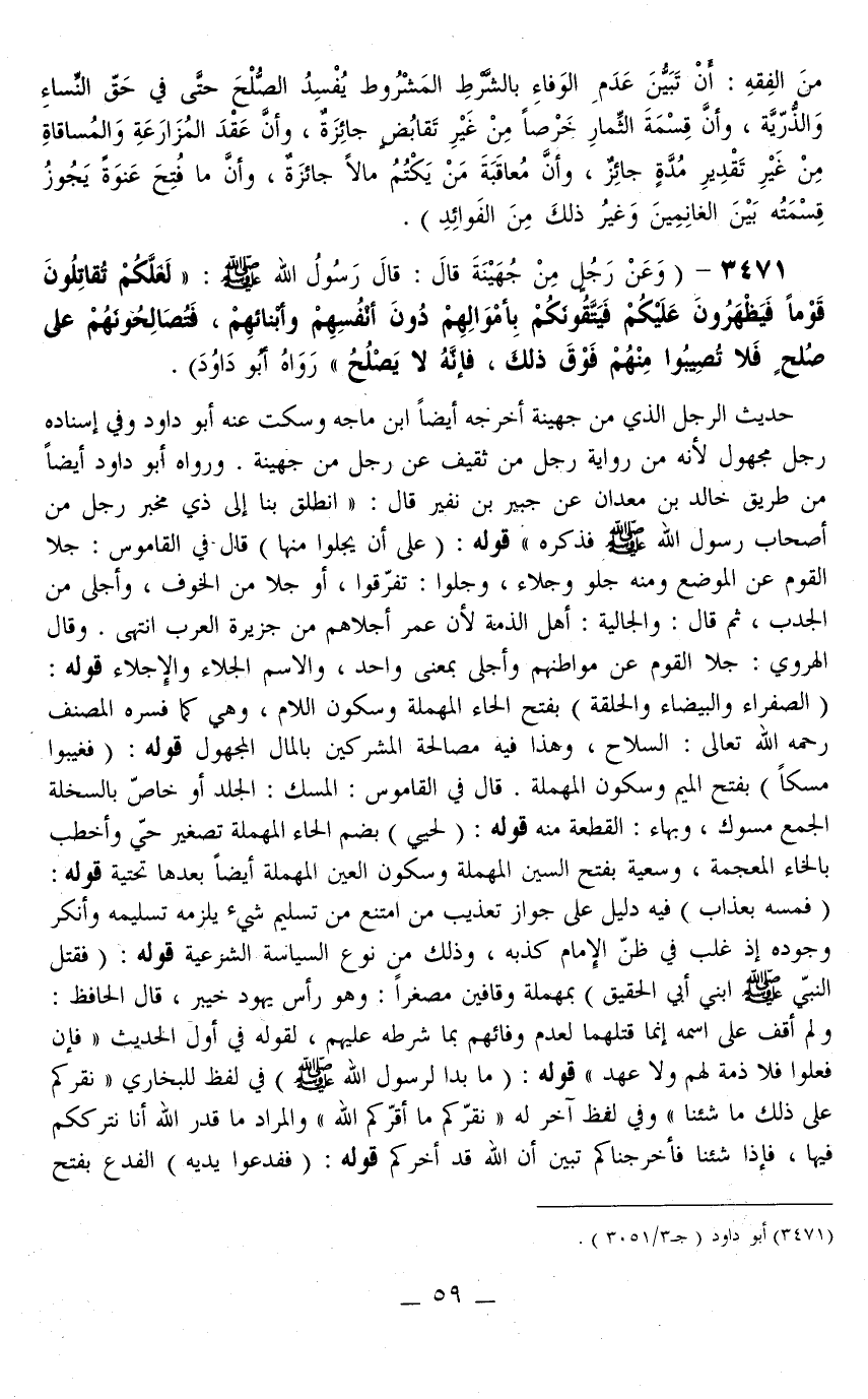 3471 - (وَعَنْ رَجُلٍ مِنْ جُهَيْنَةَ قَالَ: قَالَ رَسُولُ اللَّهِ - صَلَّى اللَّهُ عَلَيْهِ وَسَلَّمَ -: «لَعَلَّكُمْ تُقَاتِلُونَ قَوْمًا فَيَظْهَرُونَ عَلَيْكُمْ فَيَتَّقُونَكُمْ بِأَمْوَالِهِمْ دُونَ أَنْفُسِهِمْ وَأَبْنَائِهِمْ، فَتُصَالِحُونَهُمْ عَلَى صُلْحٍ فَلَا تُصِيبُوا مِنْهُمْ فَوْقَ ذَلِكَ، فَإِنَّهُ لَا يَصْلُحُ» رَوَاهُ أَبُو دَاوُد) .