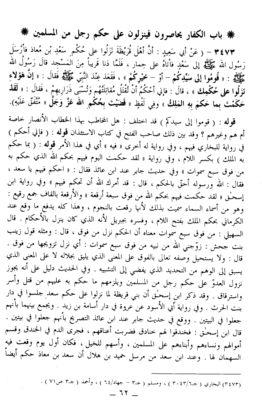 بَابٌ الْكُفَّارُ يُحَاصَرُونَ فَيَنْزِلُونَ عَلَى حُكْمِ رَجُلٍ مِنْ الْمُسْلِمِينَ (عَنْ أَبِي سَعِيدٍ: «أَنَّ أَهْلَ قُرَيْظَةَ نَزَلُوا عَلَى حُكْمِ سَعْدِ بْنِ مُعَاذٍ فَأَرْسَلَ رَسُولُ اللَّهِ - صَلَّى اللَّهُ عَلَيْهِ وَسَلَّمَ - إلَى سَعْدٍ فَأَتَاهُ عَلَى حِمَارٍ، فَلَمَّا دَنَا قَرِيبًا مِنْ الْمَسْجِدِ قَالَ رَسُولُ اللَّهِ - صَلَّى اللَّهُ عَلَيْهِ وَسَلَّمَ -: قُومُوا إلَى سَيِّدِكُمْ - أَوْ - خَيْرِكُمْ، فَقَعَدَ عِنْدَ النَّبِيِّ - صَلَّى اللَّهُ عَلَيْهِ وَسَلَّمَ - فَقَالَ: إنَّ هَؤُلَاءِ نَزَلُوا عَلَى حُكْمِكَ، قَالَ: فَإِنِّي أَحْكُمُ أَنْ تُقْتَلَ مُقَاتِلَتُهُمْ وَتُسْبَى ذَرَارِيُّهُمْ، فَقَالَ: لَقَدْ حَكَمْتَ بِمَا حَكَمَ بِهِ الْمَلِكُ وَفِي لَفْظٍ قَضَيْتَ بِحُكْمِ اللَّهِ عَزَّ وَجَلَّ» مُتَّفَقٌ عَلَيْهِ) .