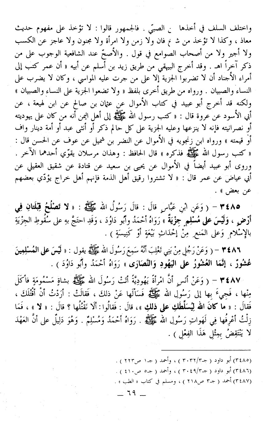 وَقَدْ أَخْرَجَ الْبَيْهَقِيُّ مِنْ طَرِيقِ زَيْدِ بْنِ أَسْلَمَ عَنْ أَبِيهِ " أَنَّ عُمَرَ كَتَبَ إلَى أُمَرَاءِ الْأَجْنَادِ أَنْ لَا تَضْرِبُوا الْجِزْيَةَ إلَّا عَلَى مَنْ جَرَتْ عَلَيْهِ الْمَوَاسِي، وَكَانَ لَا يَضْرِبُ عَلَى النِّسَاءِ وَالصِّبْيَانِ. وَرَوَاهُ مِنْ طَرِيقٍ أُخْرَى بِلَفْظِ " وَلَا تَضَعُوا الْجِزْيَةَ عَلَى النِّسَاءِ وَالصِّبْيَانِ "
