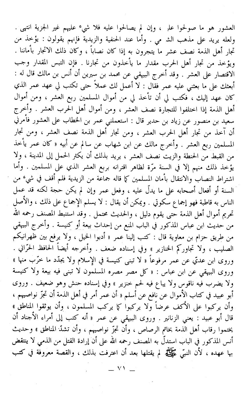 وَقَدْ أَخْرَجَ الْبَيْهَقِيُّ عَنْ مُحَمَّدِ بْنِ سِيرِينَ أَنَّ أَنَسَ بْنَ مَالِكٍ قَالَ لَهُ: أَبْعَثُكَ عَلَى مَا بَعَثَنِي عَلَيْهِ عُمَرُ فَقَالَ: لَا أَعْمَلُ لَك عَمَلًا حَتَّى تَكْتُبَ لِي عَهْدَ عُمَرَ الَّذِي كَانَ عَهِدَ إلَيْكَ، فَكَتَبَ لِي أَنْ تَأْخُذَ لِي مِنْ أَمْوَالِ الْمُسْلِمِينَ رُبْعَ الْعُشْرِ، وَمِنْ أَمْوَالِ أَهْلِ الذِّمَّةِ إذَا اخْتَلَفُوا لِلتِّجَارَةِ نِصْفَ الْعُشْرِ، وَمِنْ أَمْوَالِ أَهْلِ الْحَرْبِ الْعُشْرَ وَأَخْرَجَ سَعِيدُ بْنُ مَنْصُورٍ عَنْ زِيَادِ بْنِ حُدَيْرٍ قَالَ: اسْتَعْمَلَنِي عُمَرُ بْنُ الْخَطَّابِ عَلَى الْعُشُورِ فَأَمَرَنِي أَنْ آخُذَ مِنْ تُجَّارِ أَهْلِ الْحَرْبِ الْعُشْرَ، وَمِنْ تُجَّارِ أَهْلِ الذِّمَّةِ نِصْفَ الْعُشْرِ، وَمِنْ تُجَّارِ الْمُسْلِمِينَ رُبْعَ الْعُشْرِ وَأَخْرَجَ مَالِكٌ عَنْ ابْنِ شِهَابٍ عَنْ سَالِمٍ عَنْ أَبِيهِ " كَانَ عُمَرُ يَأْخُذُ مِنْ الْقِبْطِ مِنْ الْحِنْطَةِ وَالزَّيْتِ نِصْفَ الْعُشْرِ، يُرِيدُ بِذَلِكَ أَنْ يُكْثِرَ الْحِمْلَ إلَى الْمَدِينَةِ، وَلَا يُؤْخَذُ ذَلِكَ مِنْهُمْ إلَّا فِي السَّنَةِ مَرَّةً لَظَاهِرِ اقْتِرَانِهِ بِرُبْعِ الْعُشْرِ الَّذِي عَلَى الْمُسْلِمِينَ. وَأَمَّا اشْتِرَاطُ النِّصَابِ وَالِانْتِقَالِ بِأَمَانِ الْمُسْلِمِينَ كَمَا قَالَهُ جَمَاعَةٌ مِنْ الزَّيْدِيَّةِ فَلَمْ أَقِفْ فِي شَيْءٍ مِنْ السُّنَّةِ أَوْ أَفْعَالِ أَصْحَابِهِ عَلَى مَا يَدُلُّ عَلَيْهِ، وَفِعْلُ عُمَرَ وَإِنْ لَمْ يَكُنْ حُجَّةً لَكِنَّهُ قَدْ عَمَلَ النَّاسُ بِهِ قَاطِبَةً فَهُوَ إجْمَاعٌ سُكُوتِيٌّ. وَيُمْكِنُ أَنْ يُقَالَ: لَا يَسْلَمُ الْإِجْمَاعُ عَلَى ذَلِكَ، وَالْأَصْلُ تَحْرِيمُ أَمْوَالِ أَهْلِ الذِّمَّةِ حَتَّى يَقُومَ دَلِيلٌ، وَالْحَدِيثُ مُحْتَمَلٌ.