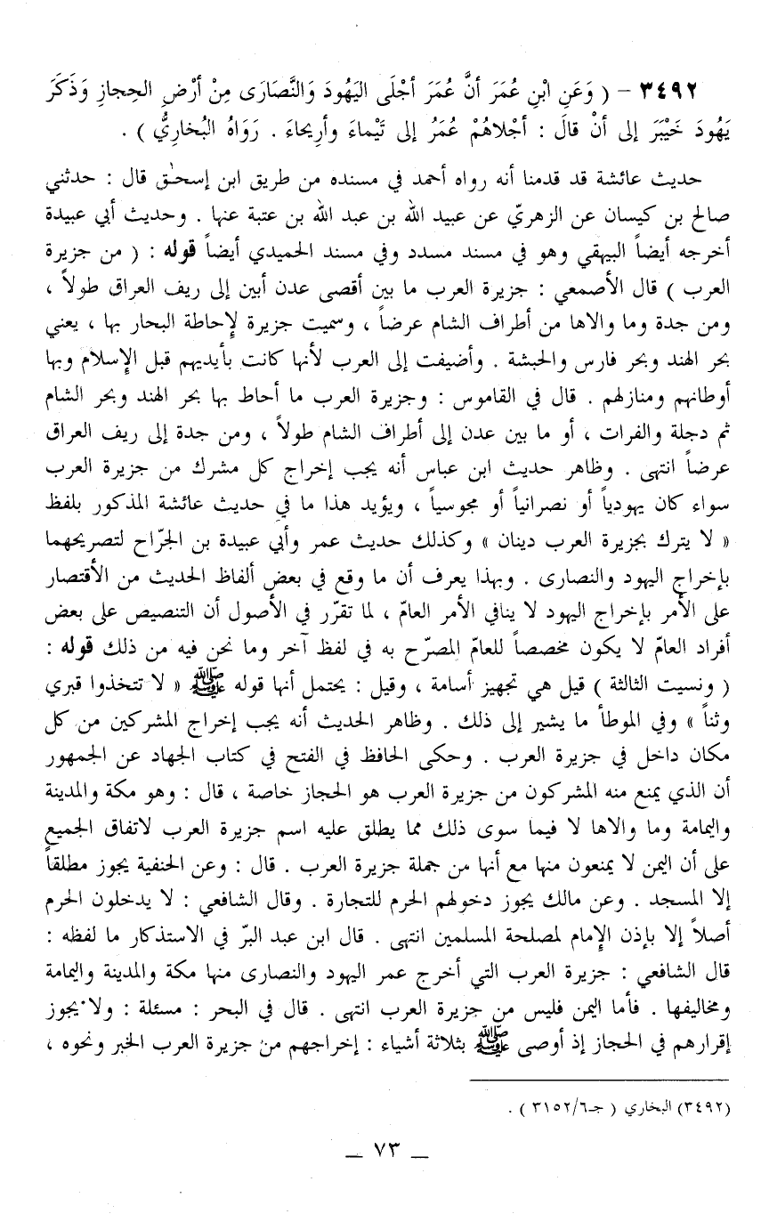وَظَاهِرُ الْحَدِيثِ أَنَّهُ يَجِبُ إخْرَاجَ الْمُشْرِكِينَ مِنْ كُلِّ مَكَانٍ دَاخِلٍ فِي جَزِيرَةِ الْعَرَبِ وَحَكَى الْحَافِظُ فِي الْفَتْحِ فِي كِتَابِ الْجِهَادِ عَنْ الْجُمْهُورِ أَنَّ الَّذِي يُمْنَعُ مِنْهُ الْمُشْرِكُونَ مِنْ جَزِيرَةِ الْعَرَبِ هُوَ الْحِجَازُ خَاصَّةً، قَالَ: وَهُوَ مَكَّةُ وَالْمَدِينَةُ وَالْيَمَامَةُ وَمَا وَالَاهَا لَا فِيمَا سِوَى ذَلِكَ مِمَّا يُطْلَقُ عَلَيْهِ اسْمُ جَزِيرَةِ الْعَرَبِ لِاتِّفَاقِ الْجَمِيعِ عَلَى أَنَّ الْيَمَنَ لَا يُمْنَعُونَ مِنْهَا مَعَ أَنَّهَا مِنْ جُمْلَةِ جَزِيرَةِ الْعَرَبِ قَالَ: وَعَنْ الْحَنَفِيَّةِ يَجُوزُ مُطْلَقًا إلَّا الْمَسْجِدَ. وَعَنْ مَالِكٍ يَجُوزُ دُخُولُهُمْ الْحَرَمَ لِلتِّجَارَةِ. وَقَالَ الشَّافِعِيُّ: لَا يَدْخُلُونَ الْحَرَمَ أَصْلًا إلَّا بِإِذْنِ الْإِمَامِ