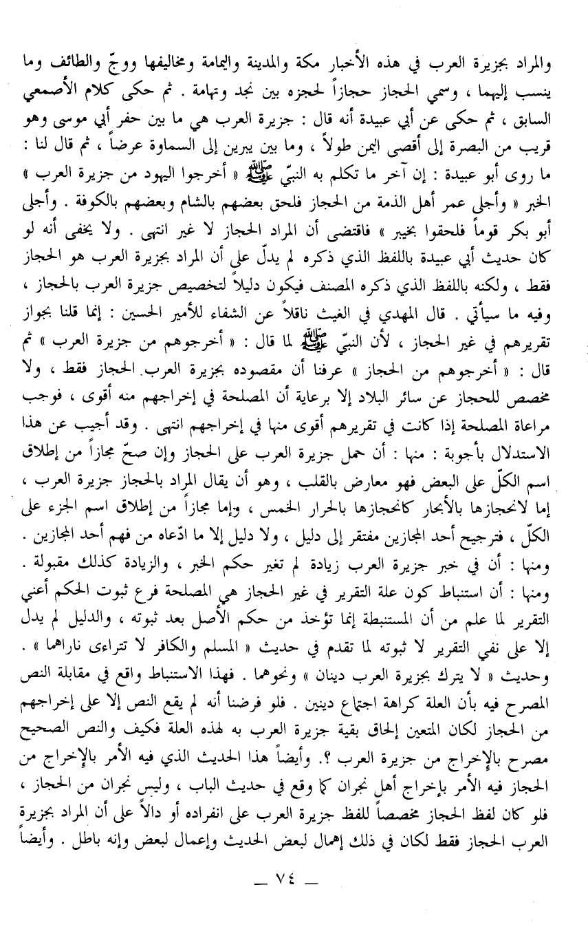 وَأَيْضًا هَذَا الْحَدِيثُ الَّذِي فِيهِ الْأَمْرُ بِالْإِخْرَاجِ مِنْ الْحِجَازِ فِيهِ الْأَمْرُ بِإِخْرَاجِ أَهْلِ نَجْرَانَ كَمَا وَقَعَ فِي حَدِيثِ الْبَابِ، وَلَيْسَ نَجْرَانُ مِنْ الْحِجَازِ، فَلَوْ كَانَ لَفْظُ الْحِجَازِ مُخَصِّصًا لِلَفْظِ جَزِيرَةِ الْعَرَبِ عَلَى انْفِرَادِهِ أَوْ دَالًّا عَلَى أَنَّ الْمُرَادَ بِجَزِيرَةِ الْعَرَبِ الْحِجَازُ فَقَطْ لَكَانَ فِي ذَلِكَ إهْمَالٌ لِبَعْضِ الْحَدِيثِ وَإِعْمَالٌ لِبَعْضٍ وَإِنَّهُ بَاطِلٌ. وَأَيْضًا