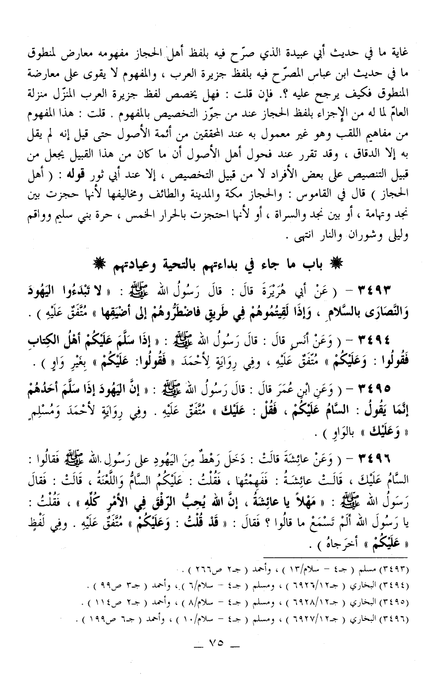 3494 - (وَعَنْ أَنَسٍ قَالَ: قَالَ رَسُولُ اللَّهِ - صَلَّى اللَّهُ عَلَيْهِ وَسَلَّمَ - «إذَا سَلَّمَ عَلَيْكُمْ أَهْلُ الْكِتَابِ فَقُولُوا: وَعَلَيْكُمْ» مُتَّفَقٌ عَلَيْهِ، وَفِي رِوَايَةٍ لِأَحْمَدَ " فَقُولُوا: عَلَيْكُمْ " بِغَيْرِ وَاوٍ) .