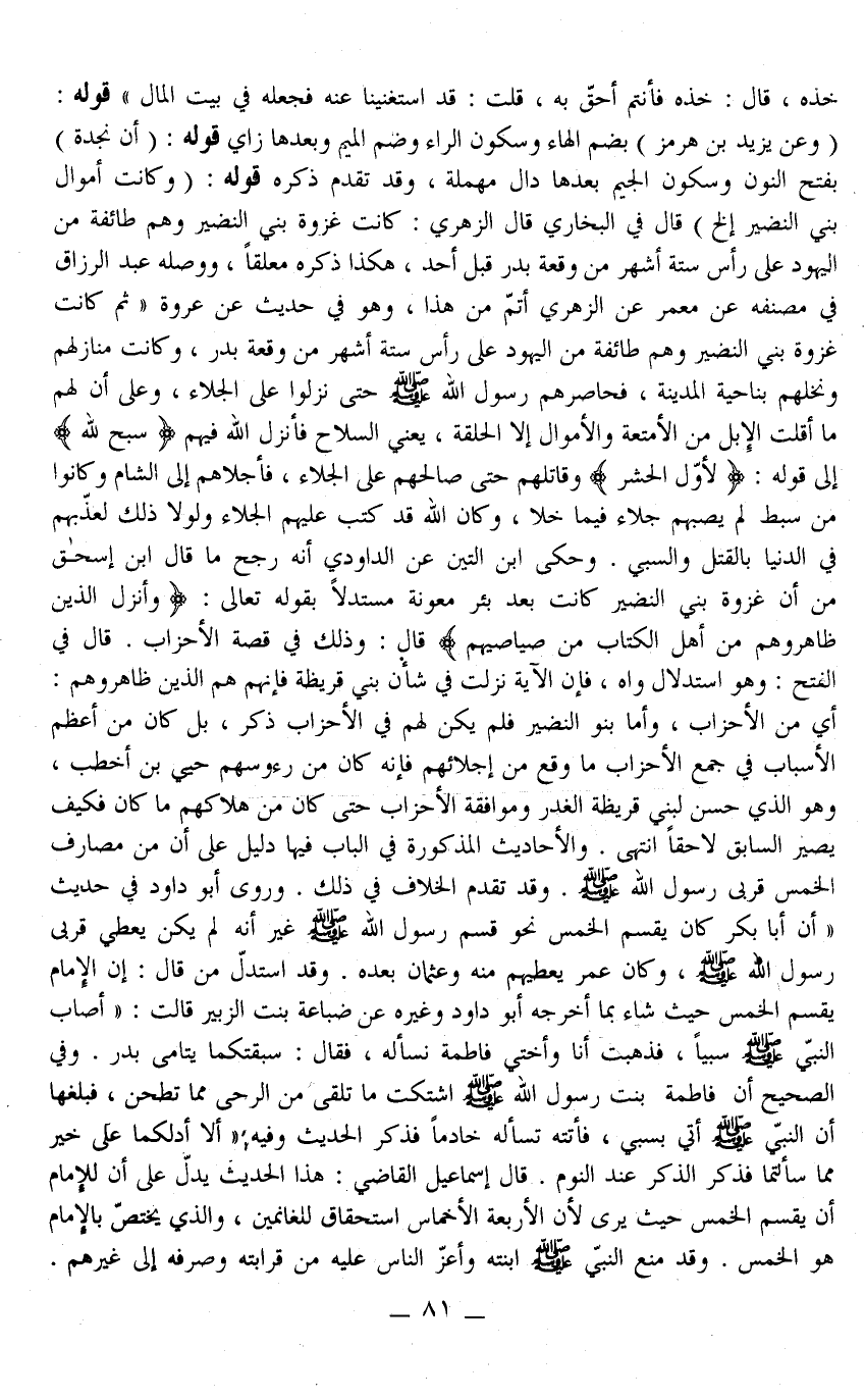 قَوْلُهُ: (وَكَانَتْ أَمْوَالُ بَنِي النَّضِيرِ. . . إلَخْ) قَالَ فِي الْبُخَارِيِّ قَالَ الزُّهْرِيُّ: كَانَتْ غَزْوَةُ بَنِي النَّضِيرِ وَهُمْ طَائِفَةٌ مِنْ الْيَهُودِ عَلَى رَأْسِ سِتَّةِ أَشْهُرٍ مِنْ وَقْعَةِ بَدْرٍ قَبْلَ أُحُدٍ، هَكَذَا ذَكَرَهُ مُعَلَّقًا، وَوَصَلَهُ عَبْدُ الرَّزَّاقِ فِي مُصَنَّفِهِ عَنْ مَعْمَرٍ عَنْ الزُّهْرِيِّ أَتَمَّ مِنْ هَذَا، وَهُوَ فِي حَدِيثٍ عَنْ عُرْوَةَ " ثُمَّ كَانَتْ غَزْوَةُ بَنِي النَّضِيرِ وَهُمْ طَائِفَةٌ مِنْ الْيَهُودِ عَلَى رَأْسِ سِتَّةِ أَشْهُرٍ مِنْ وَقْعَةِ بَدْرٍ، وَكَانَتْ مَنَازِلُهُمْ وَنَخْلُهُمْ بِنَاحِيَةِ الْمَدِينَةِ، فَحَاصَرَهُمْ رَسُولُ اللَّهِ - صَلَّى اللَّهُ عَلَيْهِ وَسَلَّمَ - حَتَّى نَزَلُوا عَلَى الْجَلَاءِ، وَعَلَى أَنَّ لَهُمْ مَا أَقَلَّتْ الْإِبِلُ مِنْ الْأَمْتِعَةِ وَالْأَمْوَالِ إلَّا الْحَلْقَةَ، يَعْنِي السِّلَاحَ فَأَنْزَلَ اللَّهُ فِيهِمْ {سَبَّحَ لِلَّهِ} [الحشر: 1] إلَى قَوْلِهِ: {لأَوَّلِ الْحَشْرِ} [الحشر: 2] وَقَاتَلَهُمْ حَتَّى صَالَحَهُمْ عَلَى الْجَلَاءِ، فَأَجْلَاهُمْ إلَى الشَّامِ وَكَانُوا مِنْ سِبْطٍ لَمْ يُصِبْهُمْ جَلَاءٌ فِيمَا خَلَا، وَكَانَ اللَّهُ قَدْ كَتَبَ عَلَيْهِمْ الْجَلَاءَ وَلَوْلَا ذَلِكَ لَعَذَّبَهُمْ فِي الدُّنْيَا بِالْقَتْلِ وَالسَّبْيِ.