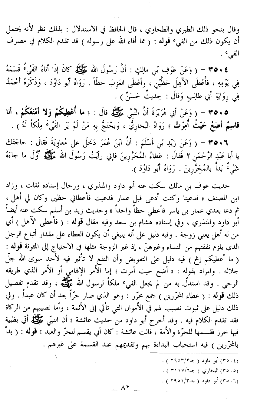 3506 - (وَعَنْ زَيْدِ بْنِ أَسْلَمَ: «أَنَّ ابْنَ عُمَرَ دَخَلَ عَلَى مُعَاوِيَةَ فَقَالَ: حَاجَتُكَ يَا أَبَا عَبْدِ الرَّحْمَنِ؟ فَقَالَ: عَطَاءُ الْمُحَرَّرِينَ فَإِنِّي رَأَيْتُ رَسُولَ اللَّهِ - صَلَّى اللَّهُ عَلَيْهِ وَسَلَّمَ - أَوَّلَ مَا جَاءَهُ شَيْءٌ بَدَأَ بِالْمُحَرَّرِينَ» رَوَاهُ أَبُو دَاوُد) . حَدِيثُ عَوْفِ بْنِ مَالِكٍ سَكَتَ عَنْهُ أَبُو دَاوُد وَالْمُنْذِرِيُّ، وَرِجَالُ إسْنَادِهِ ثِقَاتٌ، وَزَادَ الْمُصَنِّفُ " فَدُعِينَا وَكُنْت أُدْعَى قَبْلَ عَمَّارٍ فَدُعِيتُ فَأَعْطَانِي حَظَّيْنِ وَكَانَ لِي أَهْلٌ، ثُمَّ دَعَا بَعْدِي عَمَّارَ بْنَ يَاسِرٍ فَأُعْطِيَ حَظًّا وَاحِدًا " وَحَدِيثُ زَيْدِ بْنِ أَسْلَمَ سَكَتَ عَنْهُ أَيْضًا أَبُو دَاوُد وَالْمُنْذِرِيُّ، وَفِي إسْنَادِهِ هِشَامُ بْنُ سَعْدٍ وَفِيهِ مَقَالٌ