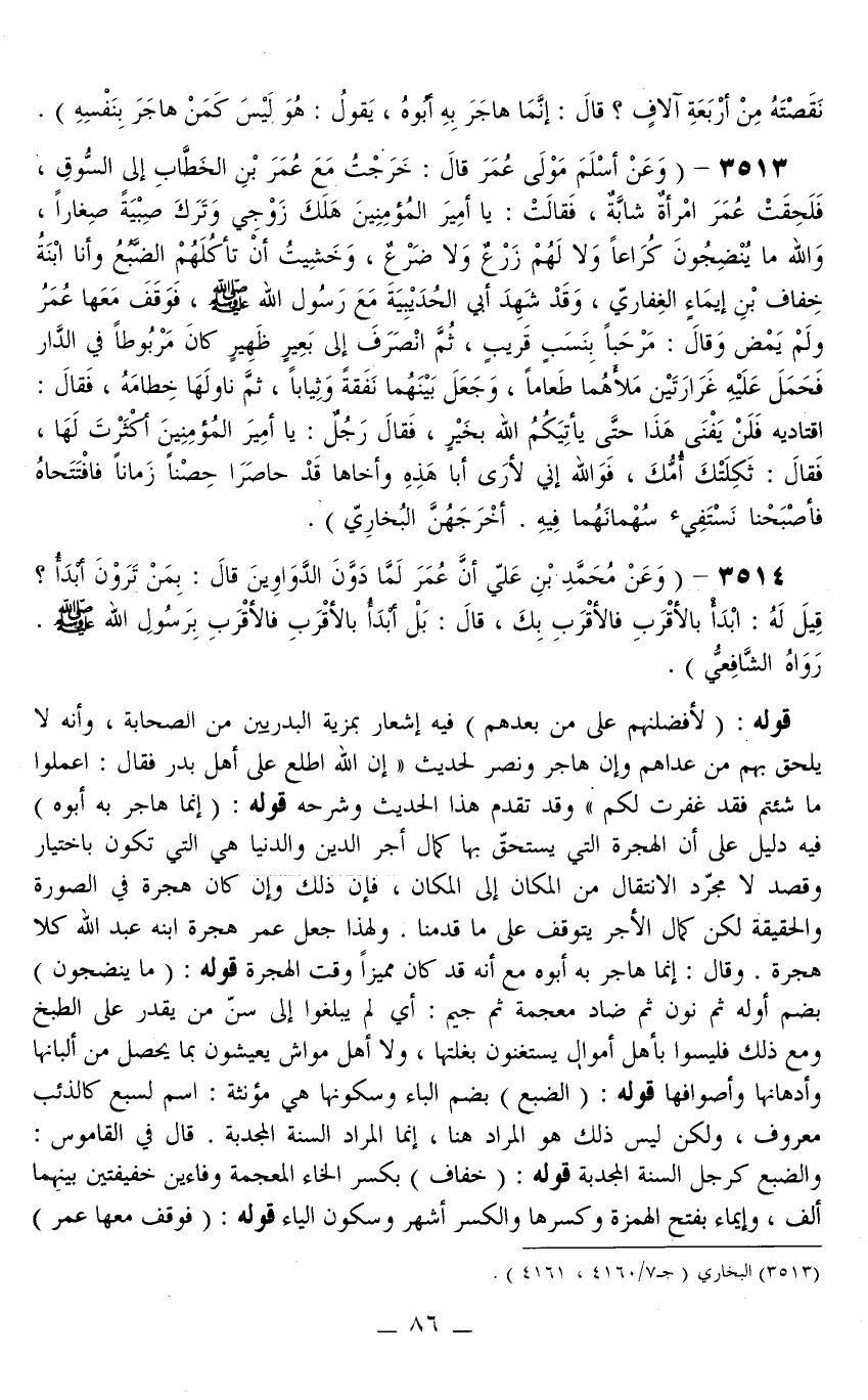 3514 - (وَعَنْ مُحَمَّدِ بْنِ عَلِيٍّ أَنَّ عُمَرَ لَمَّا دَوَّنَ الدَّوَاوِينَ قَالَ: بِمَنْ تَرَوْنَ أَبْدَأُ؟ قِيلَ لَهُ: ابْدَأْ بِالْأَقْرَبِ فَالْأَقْرَبِ بِكَ، قَالَ: بَلْ أَبْدَأُ بِالْأَقْرَبِ فَالْأَقْرَبِ بِرَسُولِ اللَّهِ - صَلَّى اللَّهُ عَلَيْهِ وَسَلَّمَ - رَوَاهُ الشَّافِعِيُّ) . قَوْلُهُ: (لَأُفَضِّلَنَّهُمْ عَلَى مَنْ بَعْدَهُمْ) فِيهِ إشْعَارٌ بِمَزِيَّةِ الْبَدْرِيِّينَ مِنْ الصَّحَابَةِ، وَأَنَّهُ لَا يَلْحَقُ بِهِمْ مَنْ عَدَاهُمْ وَإِنْ هَاجَرَ وَنَصَرَ لِحَدِيثِ «إنَّ اللَّهَ اطَّلَعَ عَلَى أَهْلِ بَدْرٍ فَقَالَ: اعْمَلُوا مَا شِئْتُمْ فَقَدْ غَفَرْتُ لَكُمْ» وَقَدْ تَقَدَّمَ هَذَا الْحَدِيثُ وَشَرْحُهُ قَوْلُهُ: (إنَّمَا هَاجَرَ بِهِ أَبُوهُ) فِيهِ دَلِيلٌ عَلَى أَنَّ الْهِجْرَةَ الَّتِي يَسْتَحِقُّ بِهَا كَمَالَ أَجْرِ الدِّينِ وَالدُّنْيَا هِيَ الَّتِي تَكُونُ بِاخْتِيَارٍ وَقَصْدٍ لَا مُجَرَّدِ الِانْتِقَالِ مِنْ الْمَكَانِ إلَى الْمَكَانِ، فَإِنَّ ذَلِكَ وَإِنْ كَانَ هِجْرَةً فِي الصُّورَةِ وَالْحَقِيقَةِ لَكِنَّ كَمَالَ الْأَجْرِ يَتَوَقَّفُ عَلَى مَا قَدَّمْنَا. وَلِهَذَا جَعَلَ عُمَرُ هِجْرَةَ ابْنِهِ عَبْدِ اللَّهِ كَلَا هِجْرَةَ.