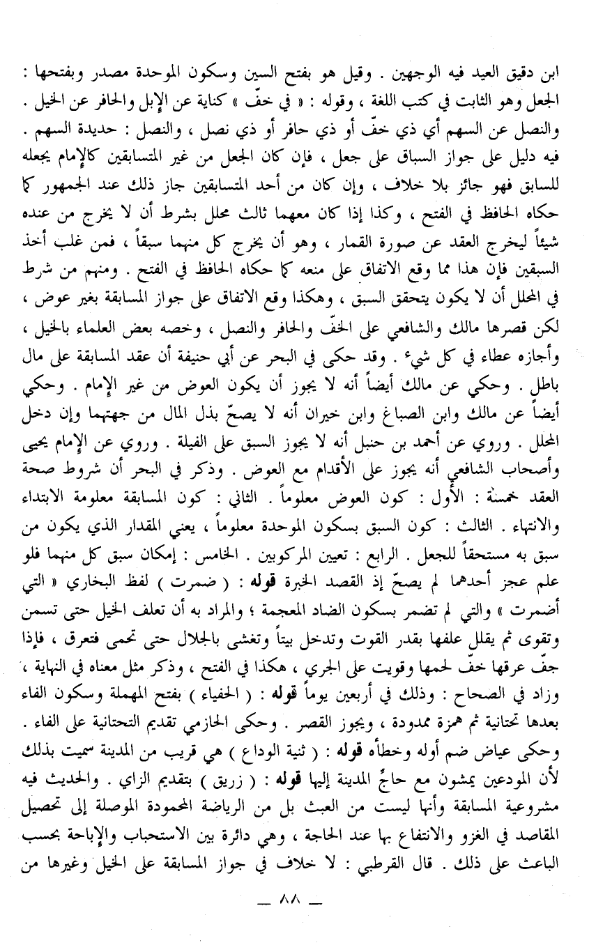 وَرُوِيَ عَنْ الْإِمَامِ يَحْيَى وَأَصْحَابِ الشَّافِعِيِّ أَنَّهُ يَجُوزُ عَلَى الْأَقْدَامِ مَعَ الْعِوَضِ. وَذَكَرَ فِي الْبَحْرِ أَنَّ شُرُوطَ صِحَّةِ الْعَقْدِ خَمْسَةٌ: الْأَوَّلُ: كَوْنُ الْعِوَضِ مَعْلُومًا. الثَّانِي: كَوْنُ الْمُسَابَقَةِ مَعْلُومَةَ الِابْتِدَاءِ وَالِانْتِهَاءِ. الثَّالِثُ: كَوْنُ السَّبْقِ بِسُكُونِ الْمُوَحَّدَةِ مَعْلُومًا، يَعْنِي الْمِقْدَارَ الَّذِي يَكُونُ مَنْ سَبَقَ بِهِ مُسْتَحِقًّا لِلْجَعْلِ. الرَّابِعُ: تَعْيِينُ الْمَرْكُوبِينَ. الْخَامِسُ: إمْكَانُ سَبْقِ كُلٍّ مِنْهُمَا فَلَوْ عُلِمَ عَجْزُ أَحَدِهِمَا لَمْ يَصِحَّ إذْ الْقَصْدُ الْخِبْرَةُ قَوْلُهُ: (ضَمُرَتْ) لَفْظُ الْبُخَارِيِّ " الَّتِي أُضْمِرَتْ " وَاَلَّتِي لَمْ تُضْمَرْ بِسُكُونِ الضَّادِ الْمُعْجَمَةِ، وَالْمُرَادُ بِهِ أَنْ تُعْلَفَ الْخَيْلُ حَتَّى تَسْمَنَ وَتَقْوَى ثُمَّ يُقَلَّلَ عَلَفُهَا بِقَدْرِ الْقُوتِ وَتُدْخَلَ بَيْتًا وَتُغَشَّى بِالْجَلَّالِ حَتَّى تُحْمَى فَتَعْرَقَ، فَإِذَا جَفَّ عِرْقُهَا خَفَّ لَحْمُهَا وَقَوِيَتْ عَلَى الْجَرْيِ، هَكَذَا فِي الْفَتْحِ، وَذَكَرَ مِثْلَ مَعْنَاهُ فِي النِّهَايَةِ، وَزَادَ فِي الصِّحَاحِ: وَذَلِكَ فِي أَرْبَعِينَ يَوْمًا قَوْلُهُ: (الْحَفْيَاءُ) بِفَتْحِ الْمُهْمَلَةِ وَسُكُونِ الْفَاءِ بَعْدَهَا تَحْتَانِيَّةٌ ثُمَّ هَمْزَةٌ مَمْدُودَةٌ، وَيَجُوزُ الْقَصْرُ. وَحَكَى الْحَازِمِيُّ تَقْدِيمَ التَّحْتَانِيَّةِ عَلَى الْفَاءِ.