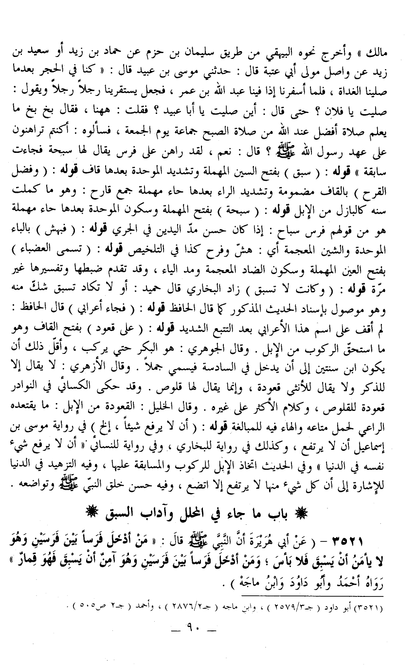 3521 - (عَنْ أَبِي هُرَيْرَةَ أَنَّ النَّبِيَّ - صَلَّى اللَّهُ عَلَيْهِ وَسَلَّمَ - قَالَ: «مَنْ أَدْخَلَ فَرَسًا بَيْنَ فَرَسَيْنِ وَهُوَ لَا يَأْمَنُ أَنْ يَسْبِقَ فَلَا بَأْسَ، وَمَنْ أَدْخَلَ فَرَسًا بَيْنَ فَرَسَيْنِ وَهُوَ آمِنٌ أَنْ يَسْبِقَ فَهُوَ قِمَارٌ» رَوَاهُ أَحْمَدُ وَأَبُو دَاوُد وَابْنُ مَاجَهْ)