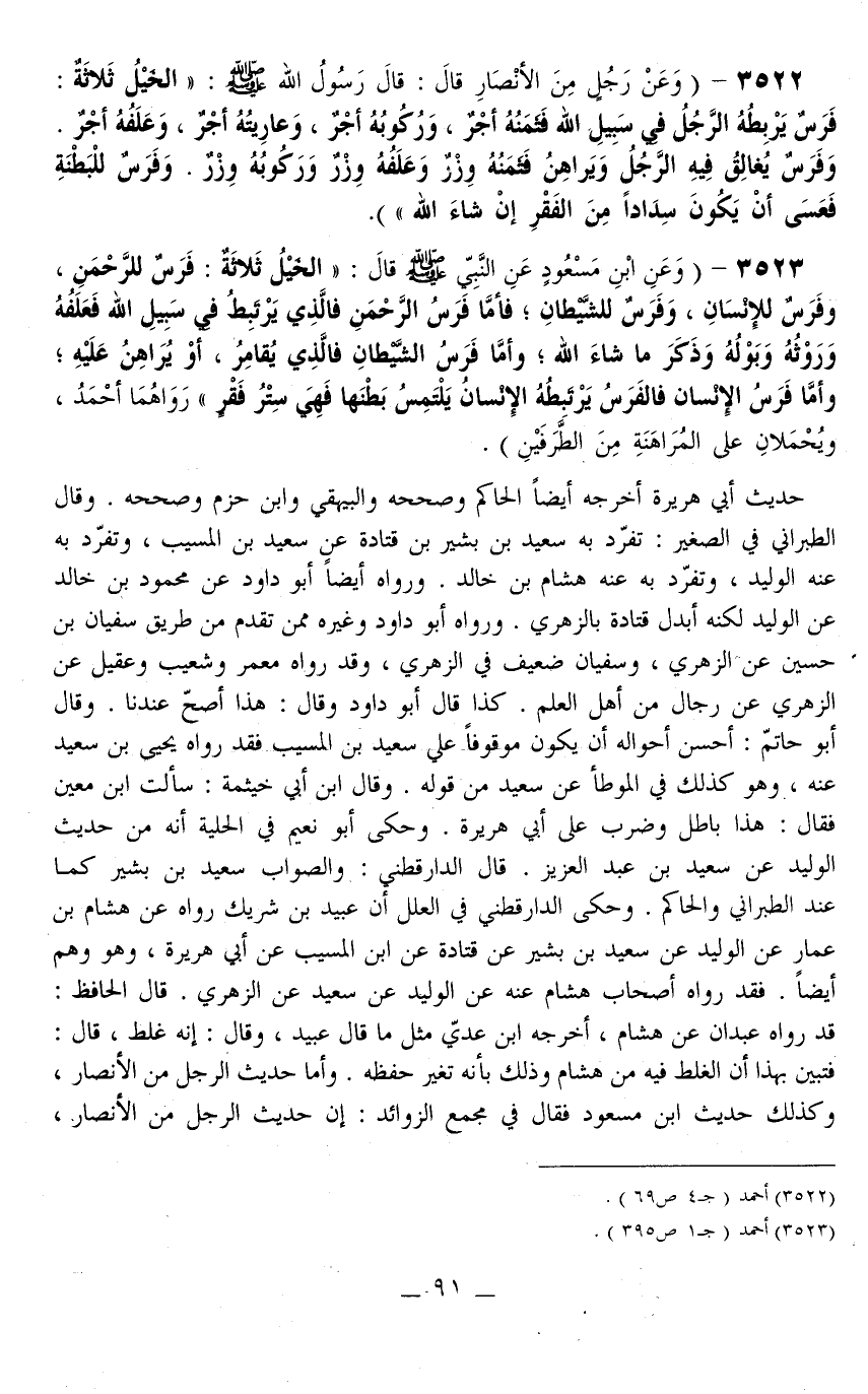 3523 - (وَعَنْ ابْنِ مَسْعُودٍ عَنْ النَّبِيِّ - صَلَّى اللَّهُ عَلَيْهِ وَسَلَّمَ - قَالَ: «الْخَيْلُ ثَلَاثَةٌ: فَرَسٌ لِلرَّحْمَنِ، وَفَرَسٌ لِلْإِنْسَانِ، وَفَرَسٌ لِلشَّيْطَانِ، فَأَمَّا فَرَسُ الرَّحْمَنِ فَاَلَّذِي يَرْتَبِطُ فِي سَبِيلِ اللَّهِ فَعَلَفُهُ وَرَوْثُهُ وَبَوْلُهُ وَذَكَرَ مَا شَاءَ اللَّهُ، وَأَمَّا فَرَسُ الشَّيْطَانِ فَاَلَّذِي يُقَامِرُ، أَوْ يُرَاهِنُ عَلَيْهِ، وَأَمَّا فَرَسُ الْإِنْسَانِ فَالْفَرَسُ يَرْتَبِطُهُ الْإِنْسَانُ يَلْتَمِسُ بَطْنَهَا فَهِيَ سِتْرُ فَقْرٍ» رَوَاهُمَا أَحْمَدُ، وَيُحْمَلَانِ عَلَى الْمُرَاهَنَةِ مِنْ الطَّرَفَيْنِ) .