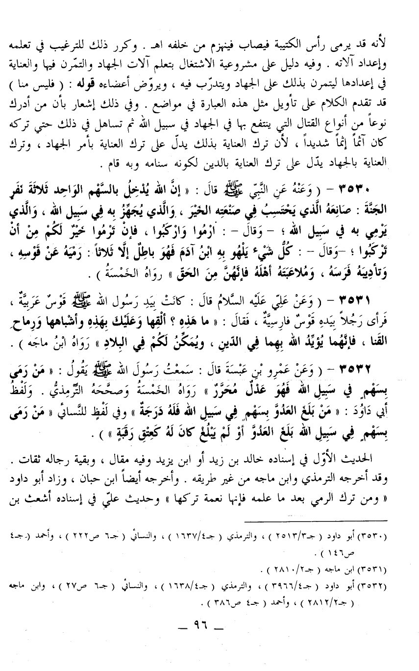 3532 - (وَعَنْ عَمْرِو بْنِ عَبَسَةَ قَالَ: سَمِعْتُ رَسُولَ اللَّه - صَلَّى اللَّهُ عَلَيْهِ وَسَلَّمَ - يَقُولُ: «مَنْ رَمَى بِسَهْمٍ فِي سَبِيلِ اللَّهِ فَهُوَ عَدْلٌ مُحَرَّرٌ» رَوَاهُ الْخَمْسَةُ وَصَحَّحَهُ التِّرْمِذِيُّ. وَلَفْظُ أَبِي دَاوُد: «مَنْ بَلَغَ الْعَدُوَّ بِسَهْمٍ فِي سَبِيلِ اللَّهِ فَلَهُ دَرَجَةٌ» وَفِي لَفْظٍ لِلنَّسَائِيِّ «مَنْ رَمَى بِسَهْمٍ فِي سَبِيلِ اللَّهِ بَلَغَ الْعَدُوَّ أَوْ لَمْ يَبْلُغْ كَانَ لَهُ كَعِتْقِ رَقَبَةٍ» ) . الْحَدِيثُ الْأَوَّلُ فِي إسْنَادِهِ خَالِدُ بْنُ زَيْدٍ أَوْ ابْنُ يَزِيدَ وَفِيهِ مَقَالٌ، وَبَقِيَّةُ رِجَالِهِ ثِقَاتٌ. وَقَدْ أَخْرَجَهُ التِّرْمِذِيُّ وَابْنُ مَاجَهْ مِنْ غَيْرِ طَرِيقِهِ. وَأَخْرَجَهُ أَيْضًا ابْنُ حِبَّانَ، وَزَادَ أَبُو دَاوُد " وَمَنْ تَرَكَ الرَّمْيَ بَعْدَمَا عَلِمَهُ فَإِنَّهَا نِعْمَةٌ تَرَكَهَا " وَحَدِيثُ عَلِيٍّ فِي إسْنَادِهِ أَشْعَثُ بْنُ