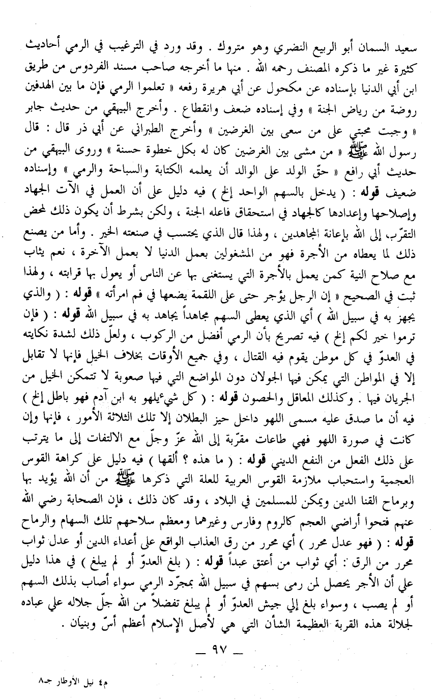 وَكَذَلِكَ الْمَعَاقِلُ وَالْحُصُونُ قَوْلُهُ: (كُلُّ شَيْءٍ يَلْهُو بِهِ ابْنُ آدَمَ فَهُوَ بَاطِلٌ. . . إلَخْ) فِيهِ أَنَّ مَا صَدَقَ عَلَيْهِ مُسَمَّى اللَّهْوِ دَاخِلٌ حَيِّزَ الْبُطْلَانِ إلَّا تِلْكَ الثَّلَاثَةَ الْأُمُورَ، فَإِنَّهَا وَإِنْ كَانَتْ فِي صُورَةِ اللَّهْوِ فَهِيَ طَاعَاتٌ مُقَرِّبَةٌ إلَى اللَّهِ عَزَّ وَجَلَّ مَعَ الِالْتِفَاتِ إلَى مَا يَتَرَتَّبُ عَلَى ذَلِكَ الْفِعْلِ مِنْ النَّفْعِ الدِّينِيِّ قَوْلُهُ: (مَا هَذِهِ؟ أَلْقِهَا) فِيهِ دَلِيلٌ عَلَى كَرَاهَةِ الْقَوْسِ الْعَجَمِيَّةِ وَاسْتِحْبَابِ مُلَازَمَةِ الْقَوْسِ الْعَرَبِيَّةِ لِلْعِلَّةِ الَّتِي ذَكَرَهَا - صَلَّى اللَّهُ عَلَيْهِ وَسَلَّمَ - مِنْ أَنَّ اللَّهَ يُؤَيِّدُ بِهَا وَبِرِمَاحِ الْقَنَا الدِّينَ وَيُمَكِّنُ لِلْمُسْلِمِينَ فِي الْبِلَادِ، وَقَدْ كَانَ ذَلِكَ، فَإِنَّ الصَّحَابَةَ - رَضِيَ اللَّهُ عَنْهُمْ - فَتَحُوا أَرَاضِيَ الْعُجْمِ كَالرُّومِ وَفَارِسَ وَغَيْرِهِمَا وَمُعْظَمُ سِلَاحِهِمْ تِلْكَ السِّهَامُ وَالرِّمَاحُ قَوْلُهُ: (فَهُوَ عَدْلٌ مُحَرَّرٌ) أَيْ مُحَرَّرٌ مِنْ رِقِّ الْعَذَابِ الْوَاقِعِ عَلَى أَعْدَاءِ الدِّينِ أَوْ عَدْلُ ثَوَابِ مُحَرِّرٍ مِنْ الرِّقِّ: أَيْ ثَوَابُ مَنْ أَعْتَقَ عَبْدًا قَوْلُهُ: (بَلَغَ الْعَدُوَّ أَوْ لَمْ يَبْلُغْ) فِي هَذَا دَلِيلٌ عَلَى أَنَّ الْأَجْرَ يَحْصُلُ لِمَنْ رَمَى بِسَهْمٍ فِي سَبِيلِ اللَّهِ بِمُجَرَّدِ الرَّمْيِ سَوَاءٌ أَصَابَ بِذَلِكَ السَّهْمِ أَوْ لَمْ يُصِبْ، وَسَوَاءٌ بَلَغَ إلَى جَيْشِ الْعَدُوِّ أَوْ لَمْ يَبْلُغْ مِنْ اللَّهِ جَلَّ جَلَالُهُ عَلَى عِبَادِهِ لِجَلَالَةِ هَذِهِ الْقُرْبَةِ الْعَظِيمَةِ الشَّأْنِ الَّتِي هِيَ لِأَصْلِ الْإِسْلَامِ أَعْظَمُ أُسٍّ وَبُنْيَانٍ.