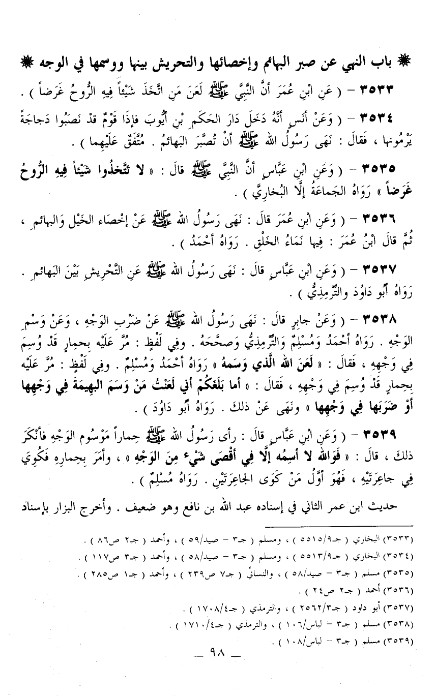 3538 - (وَعَنْ جَابِرٍ قَالَ: «نَهَى رَسُولُ اللَّهِ - صَلَّى اللَّهُ عَلَيْهِ وَسَلَّمَ - عَنْ ضَرْبِ الْوَجْهِ، وَعَنْ وَسْمِ الْوَجْهِ» رَوَاهُ أَحْمَدُ وَمُسْلِمٌ وَالتِّرْمِذِيُّ وَصَحَّحَهُ وَفِي لَفْظٍ: «مُرَّ عَلَيْهِ بِحِمَارٍ قَدْ وُسِمَ فِي وَجْهِهِ، فَقَالَ: لَعَنَ اللَّهُ الَّذِي وَسَمَهُ» رَوَاهُ أَحْمَدُ وَمُسْلِمٌ وَفِي لَفْظٍ: مُرَّ عَلَيْهِ بِحِمَارٍ قَدْ وُسِمَ فِي وَجْهِهِ، فَقَالَ: «أَمَا بَلَغَكُمْ أَنِّي لَعَنْتُ مَنْ وَسَمَ الْبَهِيمَةَ فِي وَجْهِهَا أَوْ ضَرَبَهَا فِي وَجْهِهَا» وَنَهَى عَنْ ذَلِكَ. رَوَاهُ أَبُو دَاوُد) .