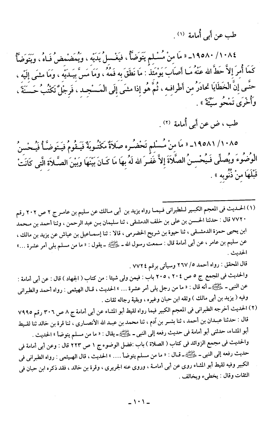(¬2) الحديث أخرجه الطبراني في المعجم الكبير فيما رواه لقيط أبو المشاء عن أبي أمامة ج 8 ص 306 رقم 7995 قال: حدثنا عبدان بن أحمد، ثنا بشر بن آدم، ثنا محمد بن عبد الله الأنصاري، ثنا قرة بن خالد ثنا لقيط أبو المشاء، حدثني أبو أمامة في حديث رفعه إلى النبي - صلى الله عليه وسلم - يقال: "ما من مسلم يتوضأ" الحديث.