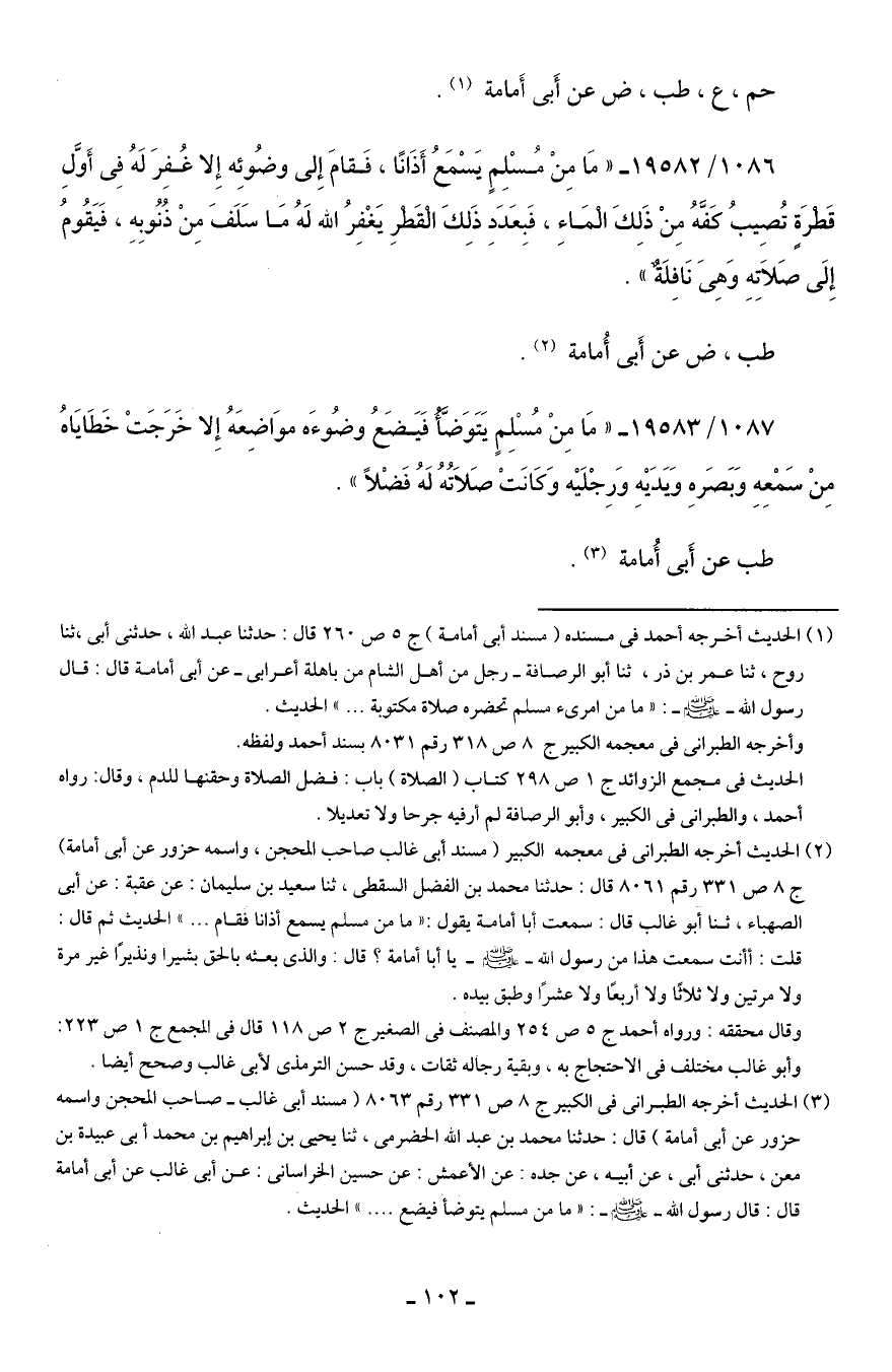(¬3) الحديث أخرجه الطبراني في الكبير ج 8 ص 331 رقم 8063 (مسند أبي غالب- صاحب المحجن واسمه حزور عن أبي أمامة) قال: حدثنا محمد بن عبد الله الحضرمي، ثنا يحيى بن إبراهيم بن محمد أبي عبيدة بن معن، حدثني أبي، عن أبيه، عن جدهْ عن الأعمش: عن حسين الخراساني: عن أبي غالب عن أبي أمامة قال: قال رسول الله - صلى الله عليه وسلم -: "ما من مسلم يتوضأ فيضع. " الحديث.