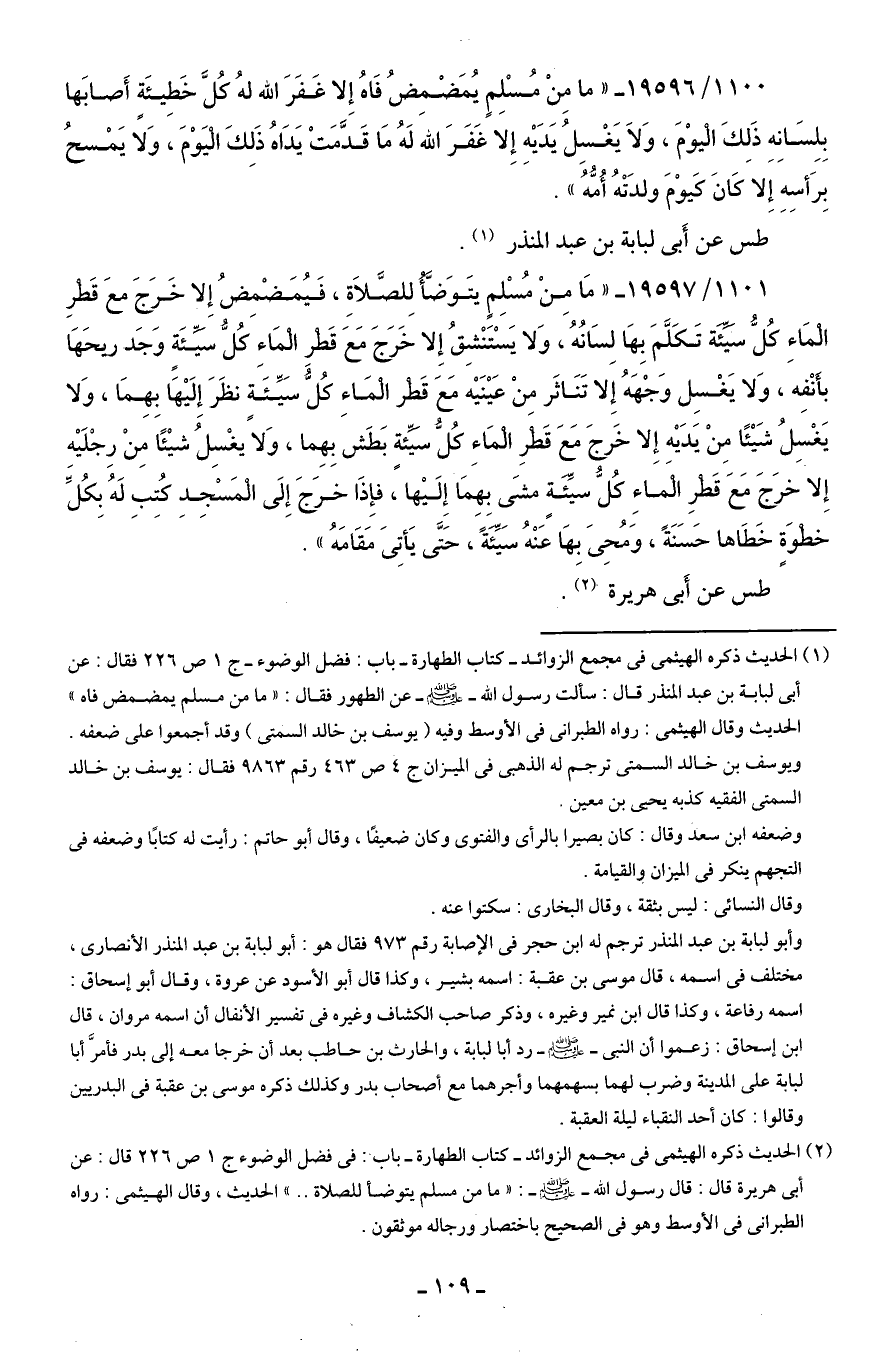1100/ 19596 - "ما مِنْ مُسْلِمٍ يُمَضْمِضُ فَاهُ إِلا غَفَرَ الله لهُ كُلَّ خَطيئَة أَصابَها بِلِسَانِهِ ذَلِكَ الْيوْمَ، وَلَا يَغْسِلُ يَدَيهِ إِلا غَفَرَ الله لَهُ مَا قَدَّمَتْ يَدَاهُ ذَلِكَ الْيَوْمَ، ولا يَمْسحُ بِرَأسِهِ إِلا كَانَ كَيوْمَ ولدَتْهُ أُمُّهُ".